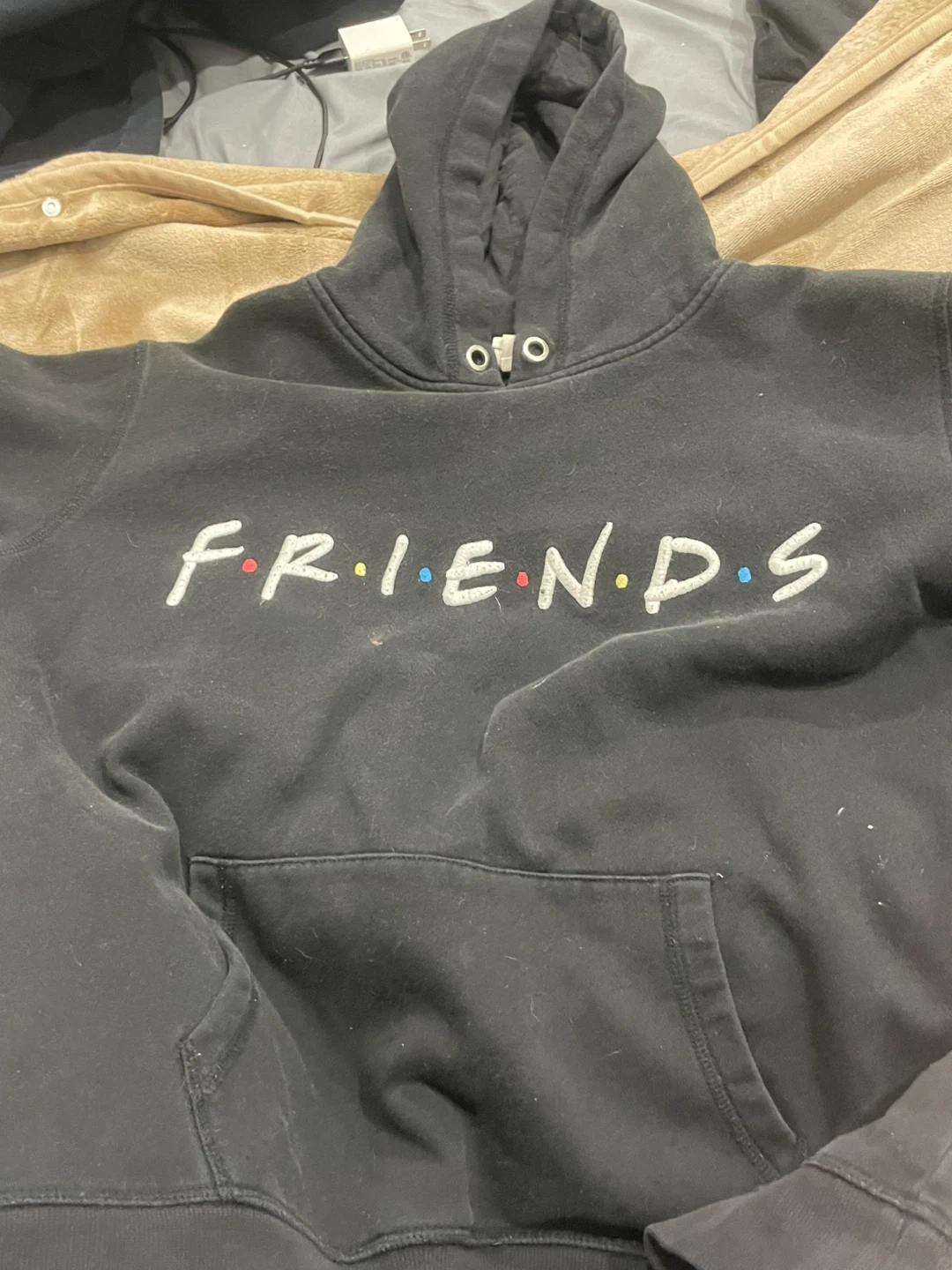 Cozy black hoodie featuring the iconic 'Friends' logo! It's a size large and in great condition. Perfect for any fan of the show! Cash only.