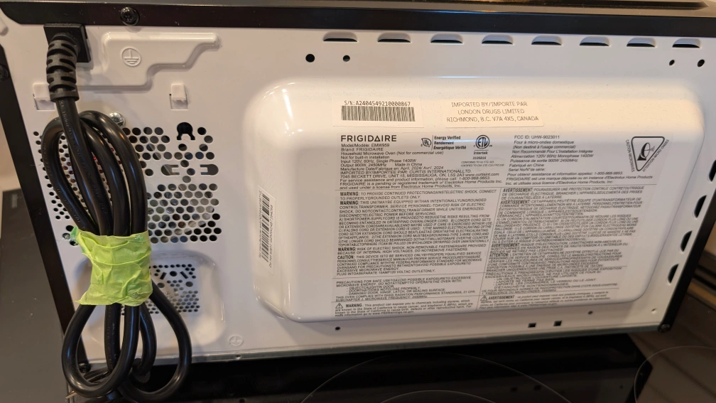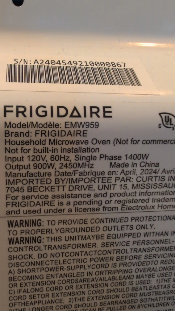 Selling a Frigidaire microwave oven, model EMW959. This household microwave is not for commercial use. It operates at 120V, 60Hz, and is a single phase 1400W unit with an output of 900W at 2450MHz. It was manufactured in April 2024.