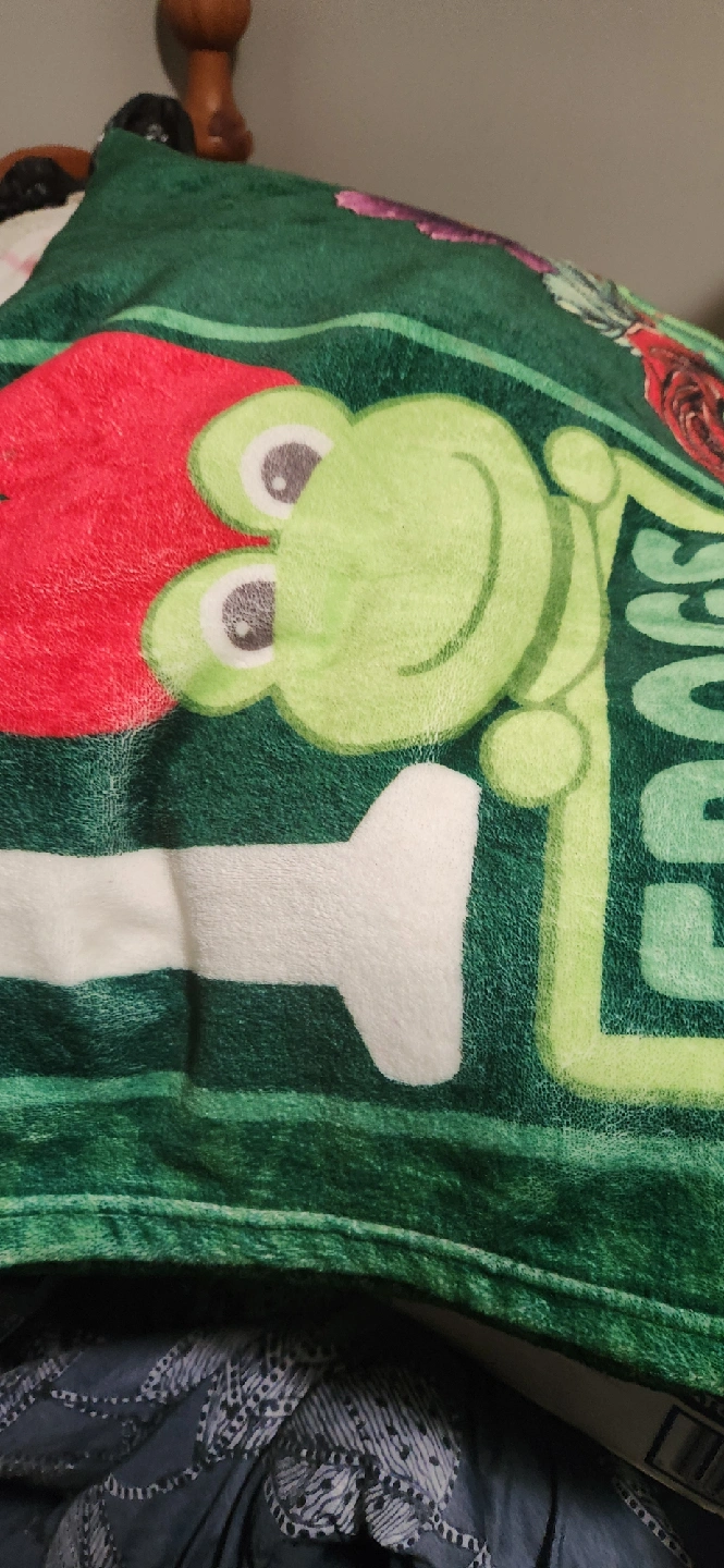 Selling a cozy frog blanket! It's green with a fun frog design. Perfect for keeping warm on chilly nights