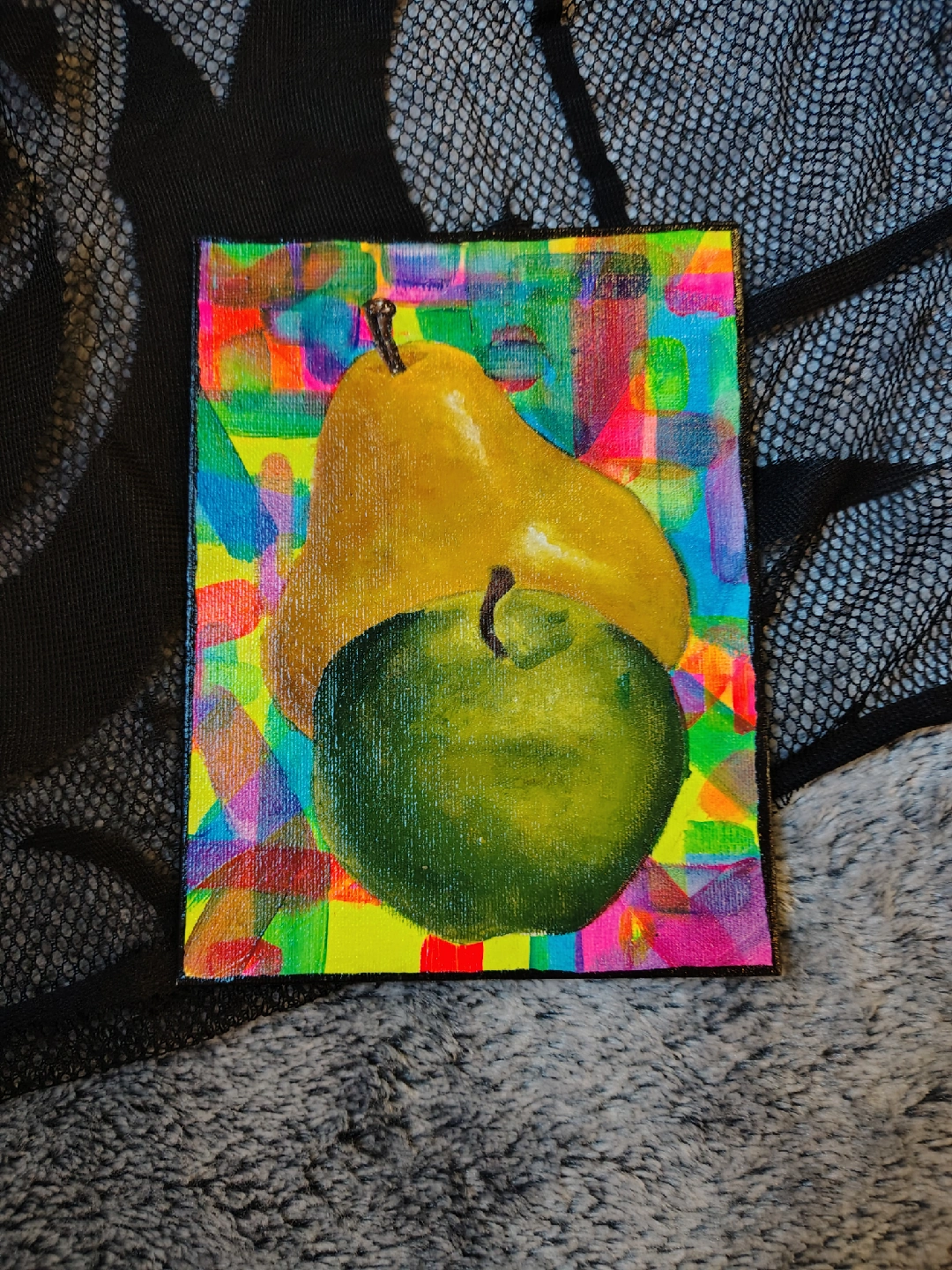 Original still life painting of a pear and an apple. The painting has a colourful background and is painted on canvas. great for a classroom! it's small so good on a desk