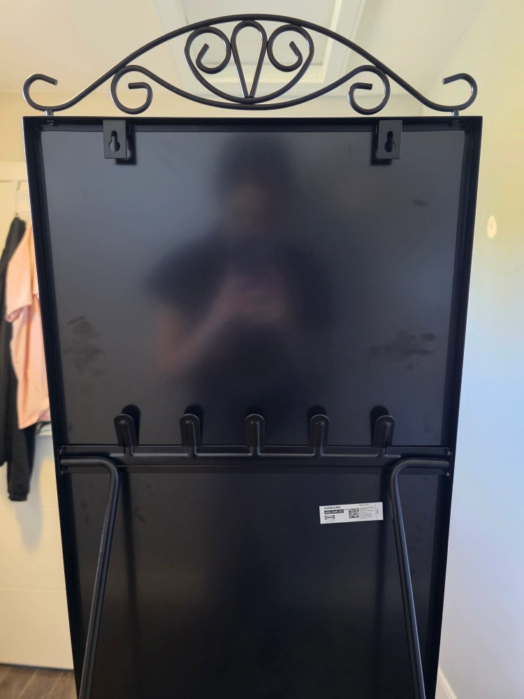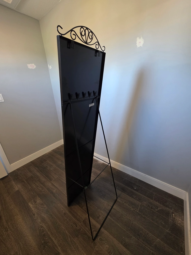 Selling an IKEA KARMSUND standing mirror. It's in very good condition and no scratches. It has hooks in the back to hang accessories like belts, scarves, hats and jewelery.