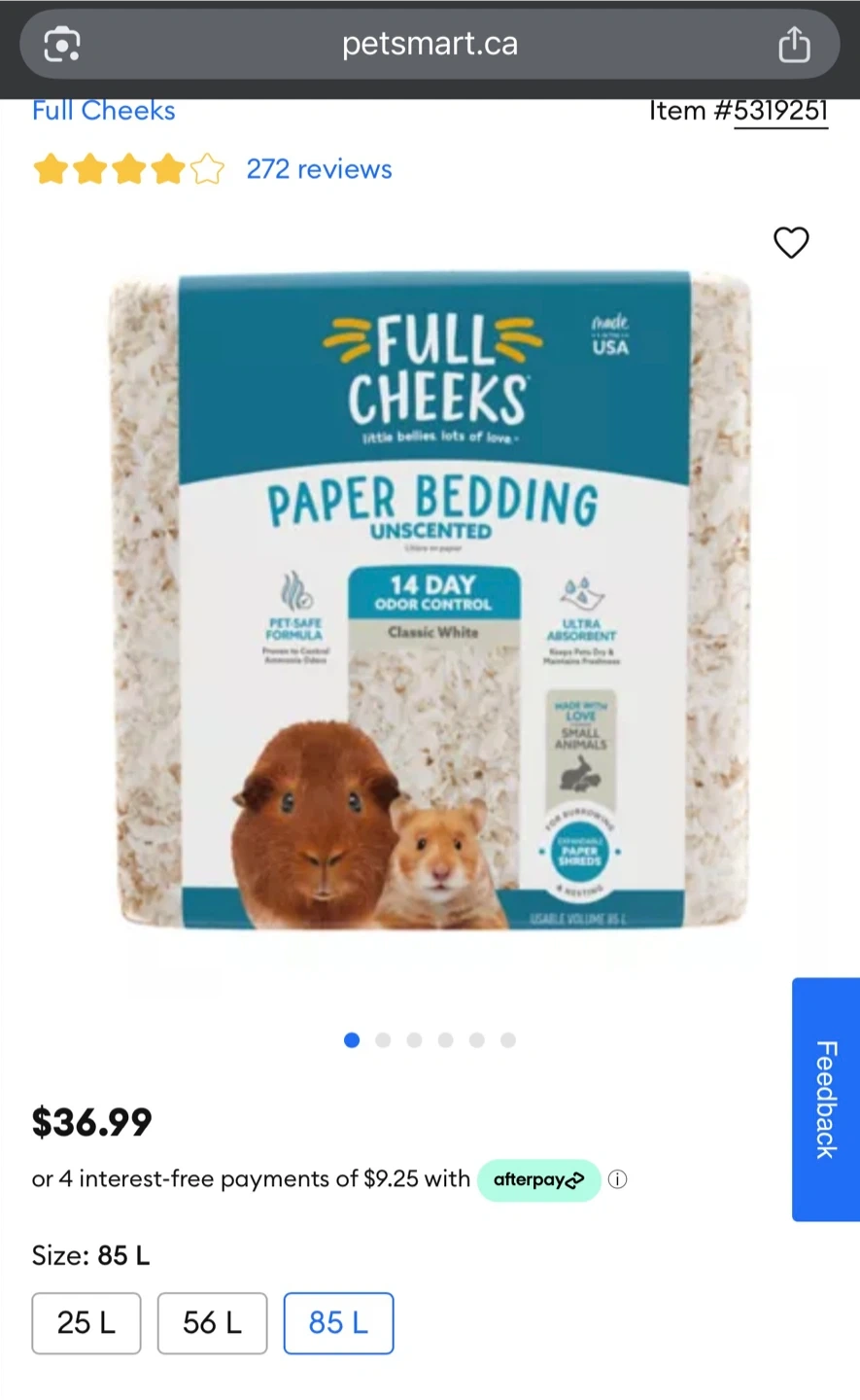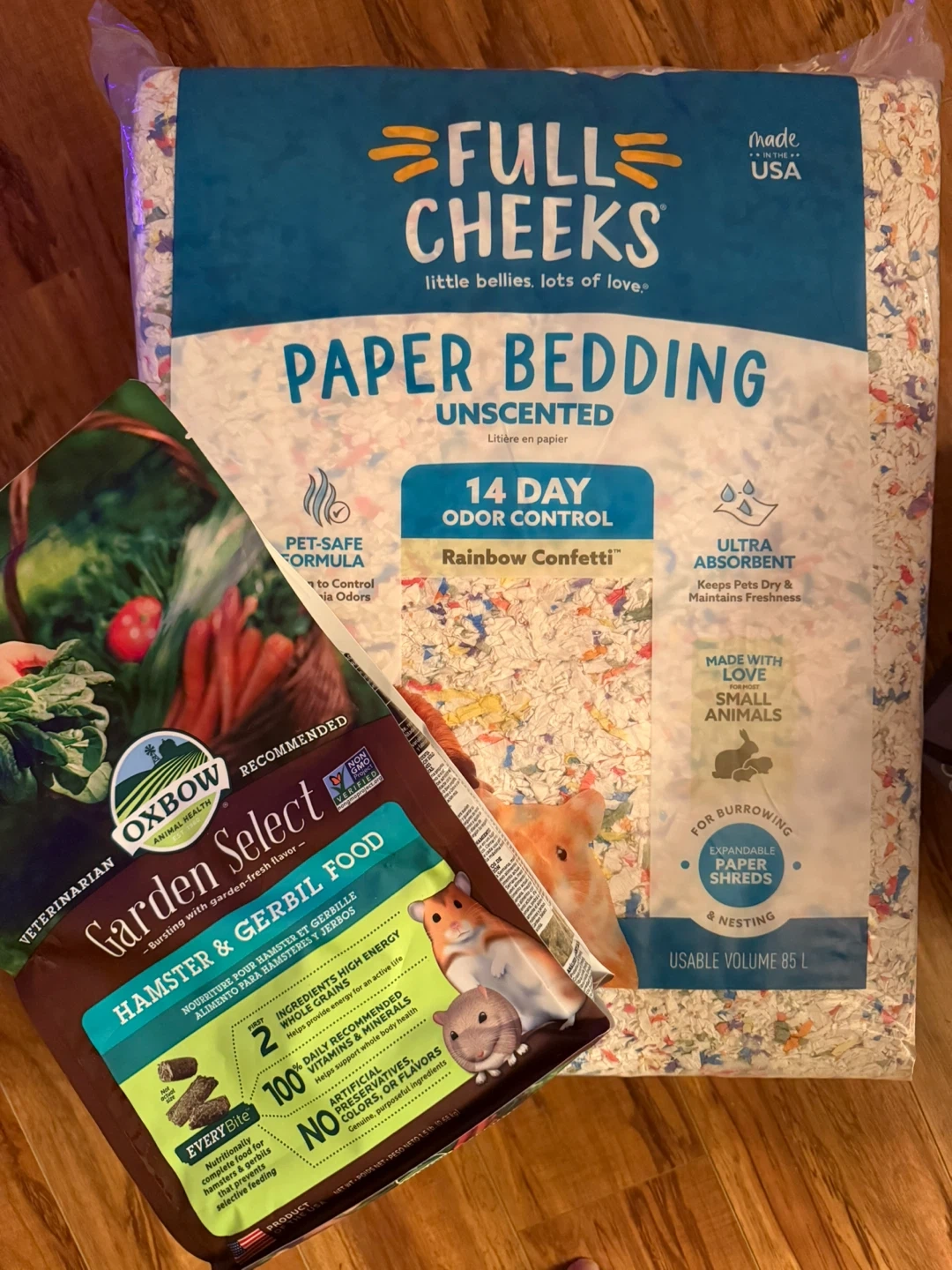 Selling a large bag of Full Cheeks Paper Bedding, unscented, with a usable volume of 85L. It's designed for small animals and offers 14-day odour control. Also included is a bag of Oxbow Garden Select Hamster & Gerbil Food, 1.5 lb Both bags are brand new