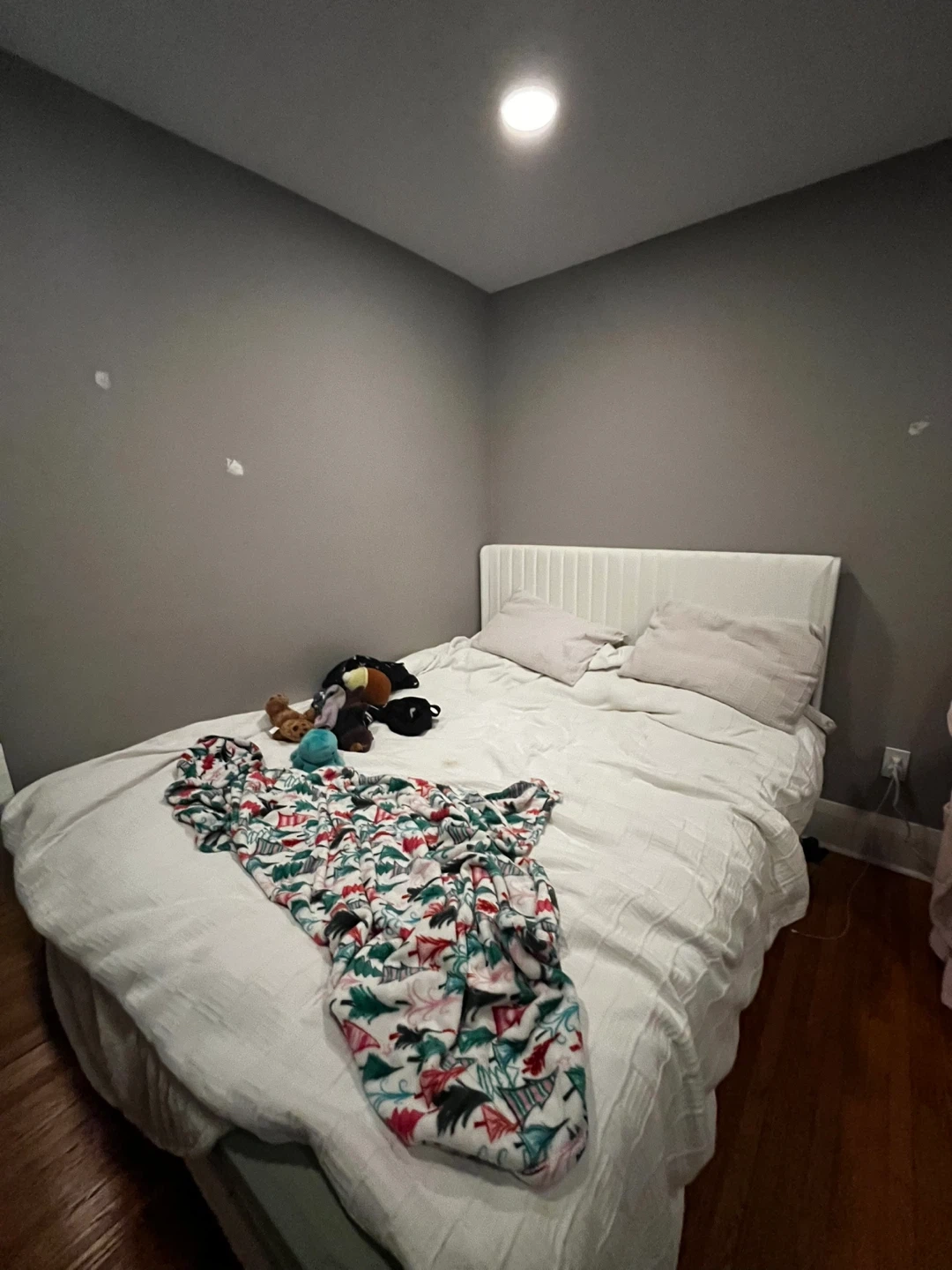Selling a full size bed frame featuring a minimalist headboard! It has wooden slats with velcro, so you don't need a box spring! The bed legs are solid wood. Already unassembled and ready to go!