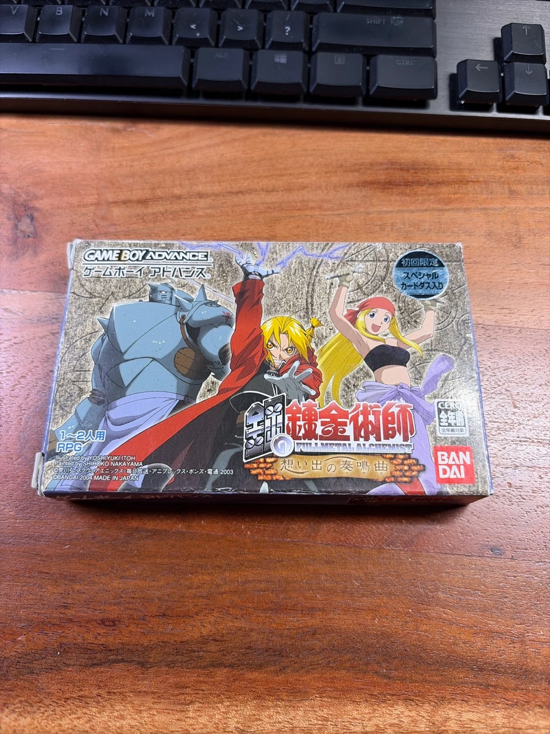 Selling a Fullmetal Alchemist game for the Game Boy Advance! It's a 1-2 player RPG illustrated by Yoshiyuki Itoh and painted by Shihoko Nakayama. Made in Japan by Bandai in 2004