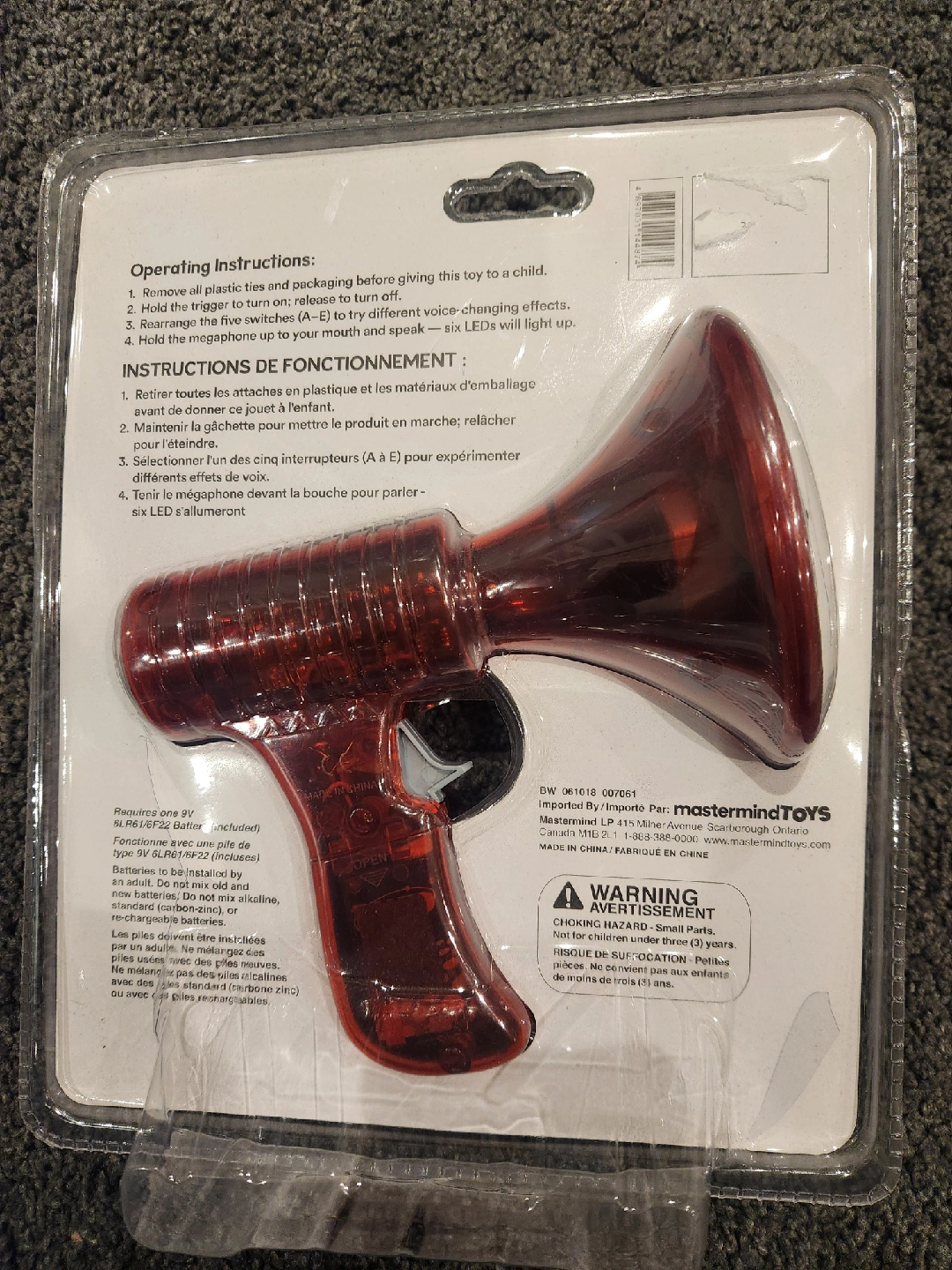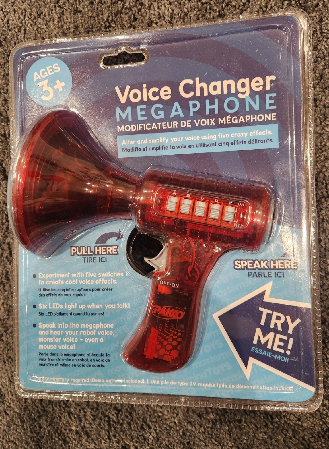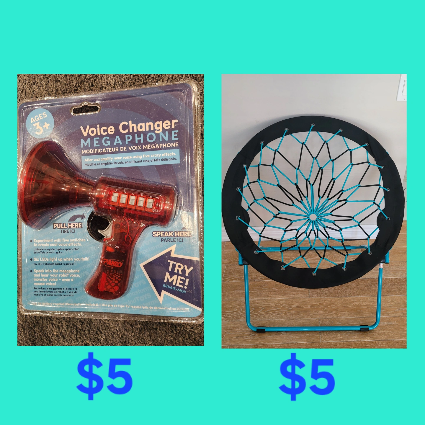 1. Folding bungee style chair in excellent condition, Diameter 32 inches (81cm) ..... $5 2. Kids voice changer toy BRAND NEW, battery operated ......$5 Cash pick up in Milton