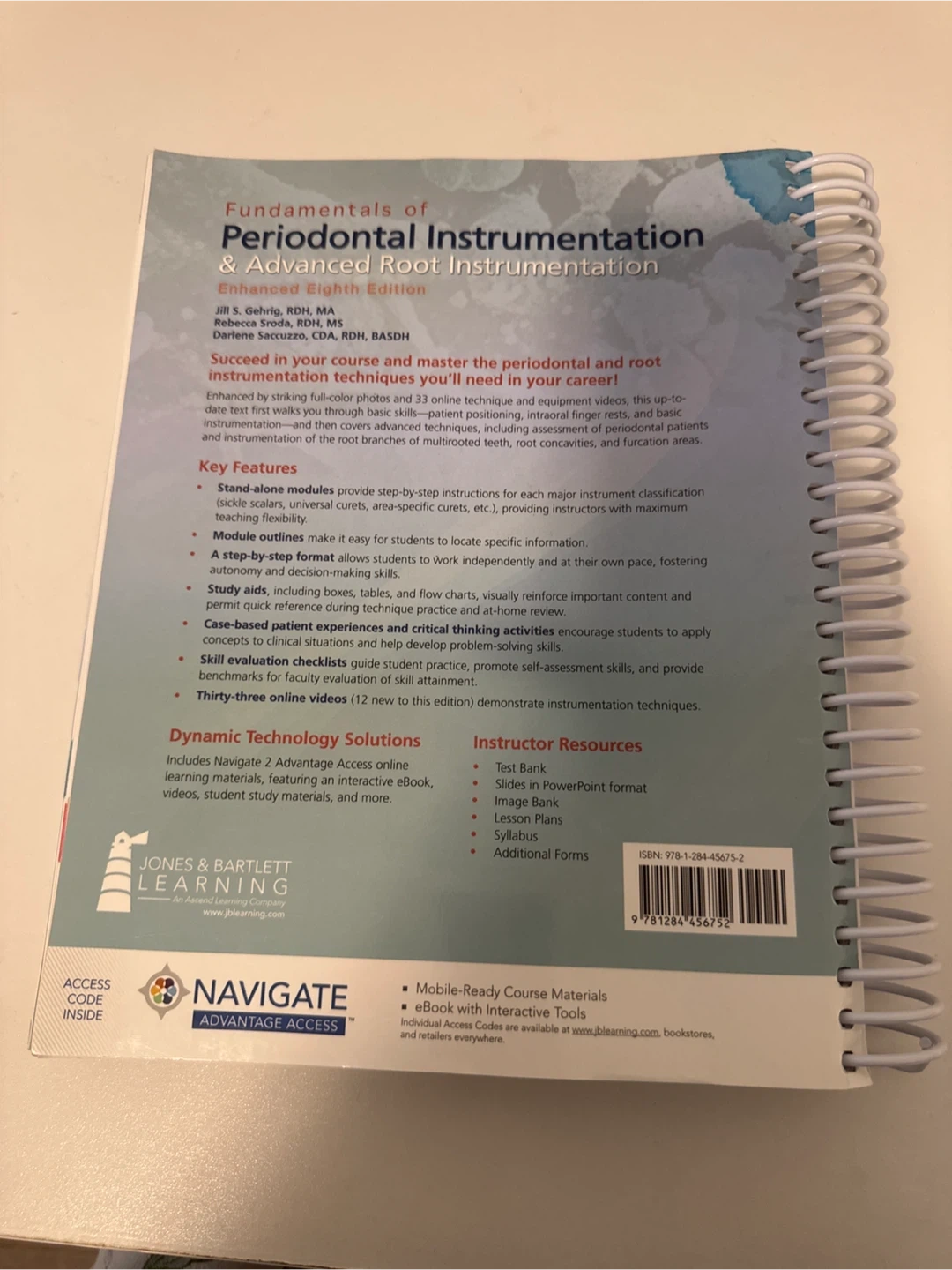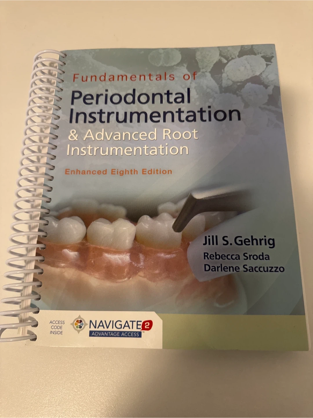 Selling a copy of 'Fundamentals of Periodontal Instrumentation & Advanced Root Instrumentation', Enhanced Eighth Edition by Jill S. Gehrig, Rebecca Sroda, and Darlene Saccuzzo. It's a great resource for anyone studying or working in the field of dental hygiene or periodontics! Includes access code inside