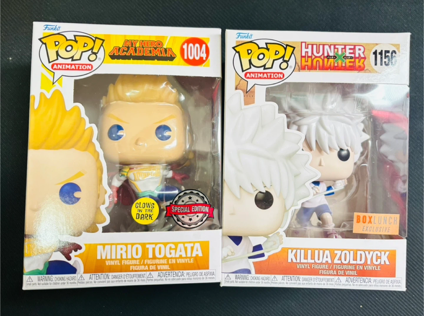 Selling two Funko Pop! Animation figures: Mirio Togata (My Hero Academia #1004) and Killua Zoldyck (Hunter x Hunter #1156) - Mirio Togata is a Special Edition that glows in the dark - Killua Zoldyck is a BoxLunch Exclusive Both figures are in their original boxes $30 each