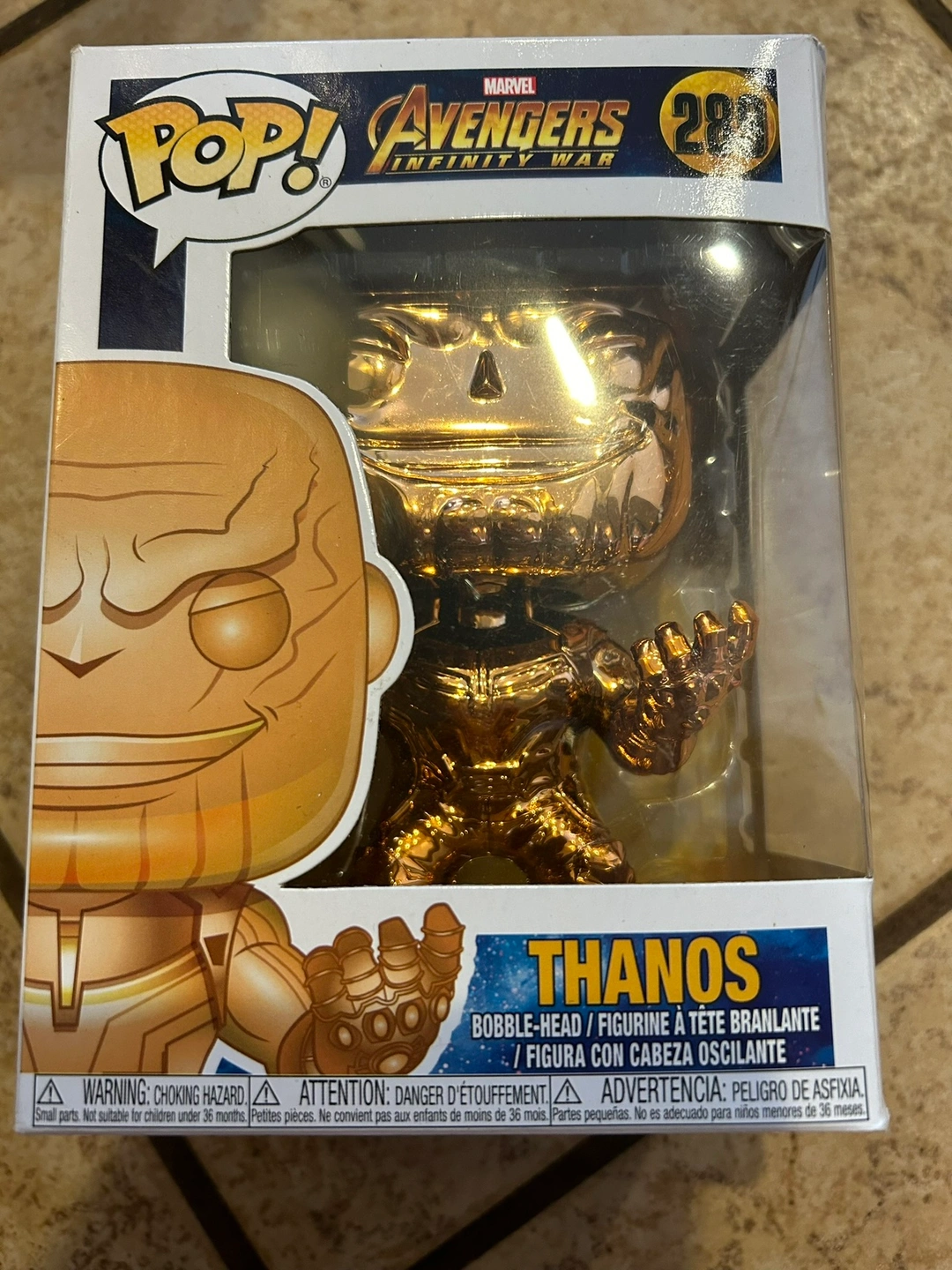 Brand new, in mint condition. This is the gold/chrome Thanos, number 289 in teh Marvel series of Funko Pop figurines.