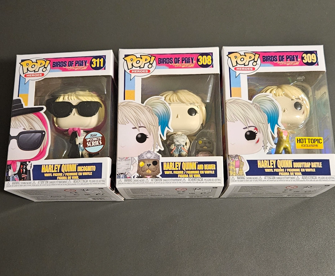 - #311 Harley Quinn Incognito (Funko Specialty Series) - #308 Harley Quinn and Beaver - #309 Harley Quinn Boobytrap Battle (Hot Topic Exclusive) All figures in their original boxes $15 each