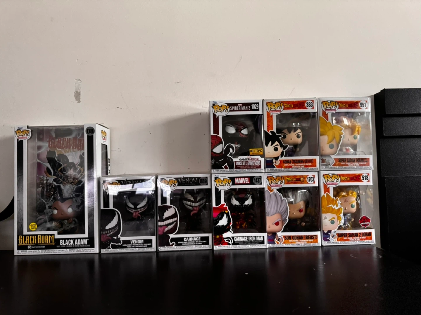 Selling a collection of Funko Pop! figures, including: - Black Adam - Venom - Carnage - Spider-Man 2 - Gohan (Training Outfit) - Super Saiyan Gohan - Carnage Iron Man - Son Gohan (Beast) All figures are in their original boxes and in new condition!