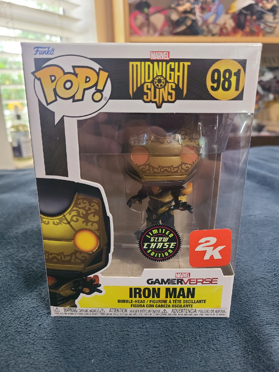 Selling a Funko Pop! figure of Iron Man from the Marvel Midnight Suns Gamerverse collection! This is figure #981 and comes in its original box. It's a bobble-head figure with a 'Limited Glow Chase Edition' sticker!