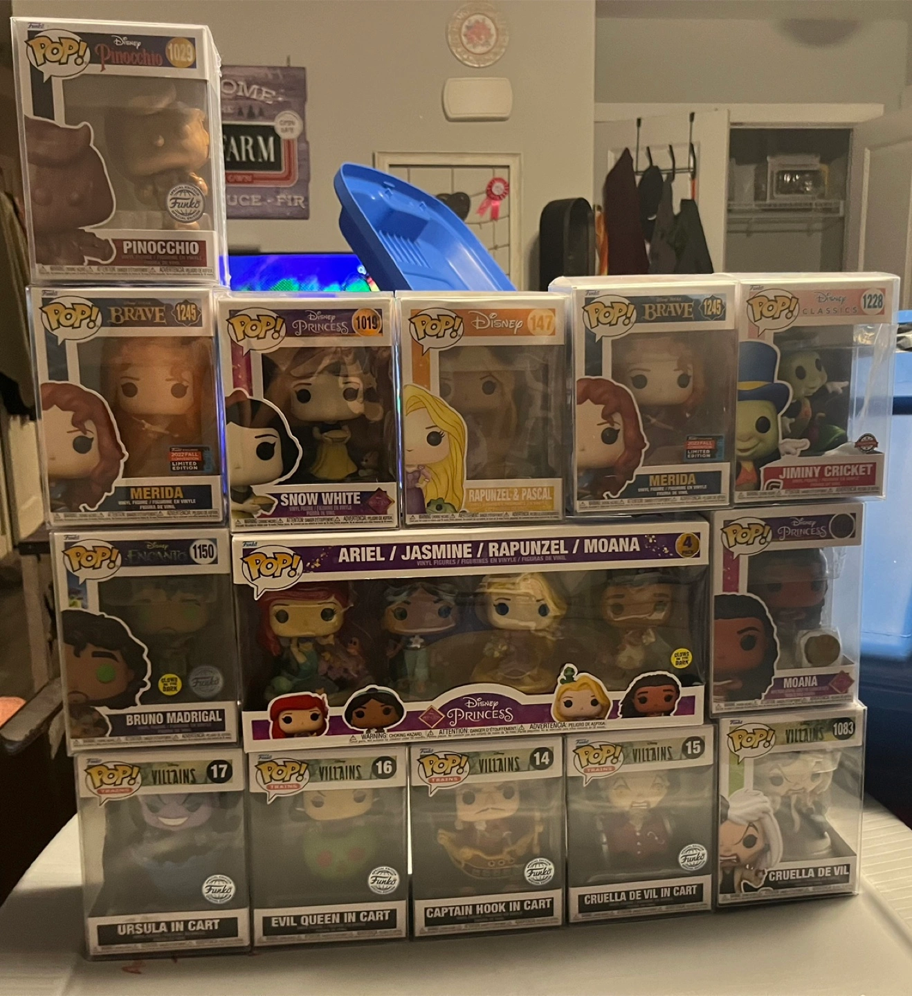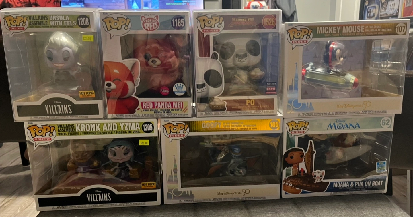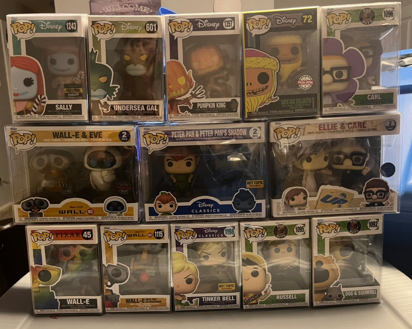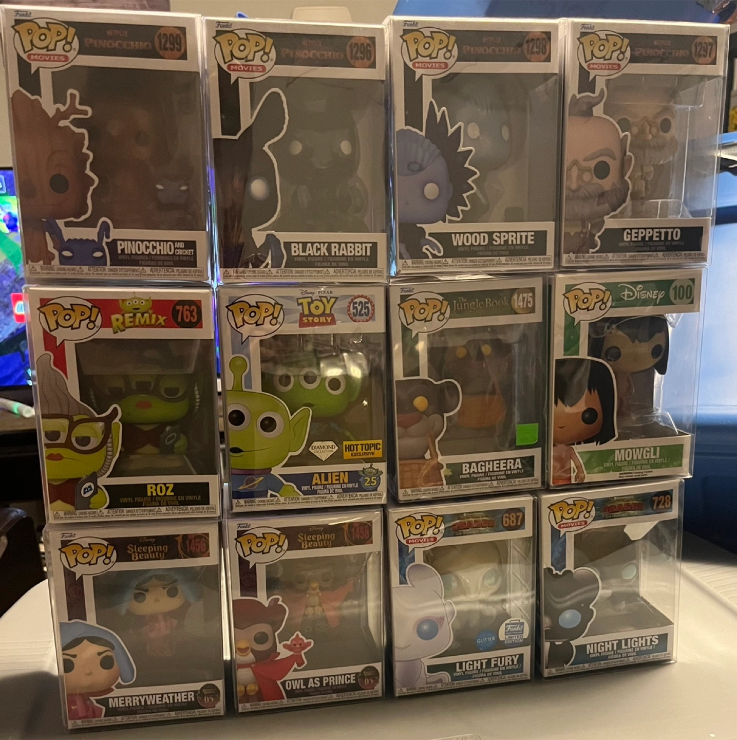 Selling a variety of Funko Pop! vinyl figures. These include characters from Disney, Pixar, and various movies. Great for collectors or anyone who loves these iconic characters! Each figure is in its original box. All Funkos come with pop protectors, never been opened, kept in storage and great condition. Open to offers BIG POP’s Moana (62) - $20 Goofy (105) - $30 Kronk N Yzma (1205) - $30 Mickey (107) - $30 Po (1526) - $40 Red Panda (1185) FLOCKED - $50 Ursula (1208) - $20 PRINCESSES Moana (1162) With funko pin - $20 Ariel/Jasmine/Rapunzel/Moana 4pack - $30 Brave (1245) - $10 Rapunzel N Pascel (147) - $15 Snow White (1019) - $10 VILLANS Ursula in cart (17) - $20 Evil Queen in cart (16) - $20 Captain Hook in cart (14) - $20 Cruella De Vil in cart (15) – 20 Cruella De Vil (1083) - $15 PINOCCHIO Pinocchio (1029) - $20 Jimmy Crickey (1228) - $ 15 NIGHTMARE BEFORE CHRISTMAS Sally (1243) - $20 Undersea Gal (601) - $ 10 Pumpkin Jack (1357) - $20 Santa Jack (72) - $20 UP/DUG DAYS Carl (1096) - $15 Dug N Squirrel (1092) - $10 Russel (1095) - $10 Ellie N Carl 2 Pack – $50 PETER PAN Tinker Bell (1198) - $25 Peter Pan N Pans Shadow 2 Pack - $25 WALL-E Wall-e N Eve 2 pack - $60 Wall-e (45) Rainbow - $ 10 Wall-e (1115) - $ 15 MICKEY MOUSE Donald Shoulder Angel & Devil 2 Pack - $50 Minnie Mouse 5 Pack - $ 30 Sorcerer Mickey (990) - $10 Princess Minnie (1110) - $10 Minnie Mouse (SE) - $ 10 Donald Duck (1128) - $10 Peter Pegasus (989) -$10 Goofy (409) - $10 Darkwing Duck (1328) - $50 SWORD AND THE STONE Madam Mim (1101) - $10 Arthur (1099) - $ 10 LILO AND STITCH Summer Stitch (636) Scented - $30 Lilo with Pudge (1047) - $20 Stitch with Turtle (1353) - $20 MONSTER INC Tylor (1113) - $5 Val (114) - $5 Mike (1487) - $ 10 LIGHTYEAR Buzz Lightyear (1230) - $10 Sox (1213) - $10 OTHER Encanto Bruno (1150) glow in dark - $ 10 Bambi (1215) - $10 Mama Odi with snake (1183) - $10 Rafiki (88) - $50 Meeko (198) - $40 Grandma Tala (418) - $15 Wreck-It-Ralph (30) 8-Bit -$20 Earth Giant (587) - $5 Quaildog (414) - $15 Quasimodo Fool (634) - $10 Cogsworth (1133) - $10 Zeus (593) - $10 Anger (136) - $50 Little John (1437) - $15 Professor Owl (1249) - $15 Sugar Mama with Puff (1175) - $10 Moonwind (746) - $5 Honey Lemon (108) - $15 Dumbo (729) DIY - $10 Flounder (237) - $40 White Rabbit (1062) - $20 Kronk (1223) - $20 Eeyore (1131) - $20