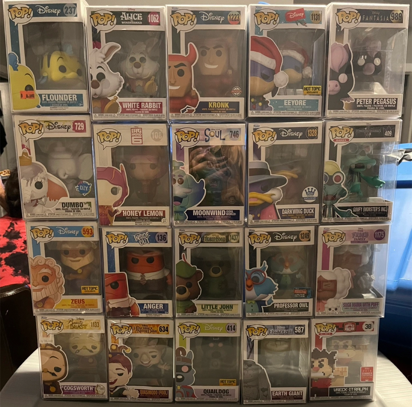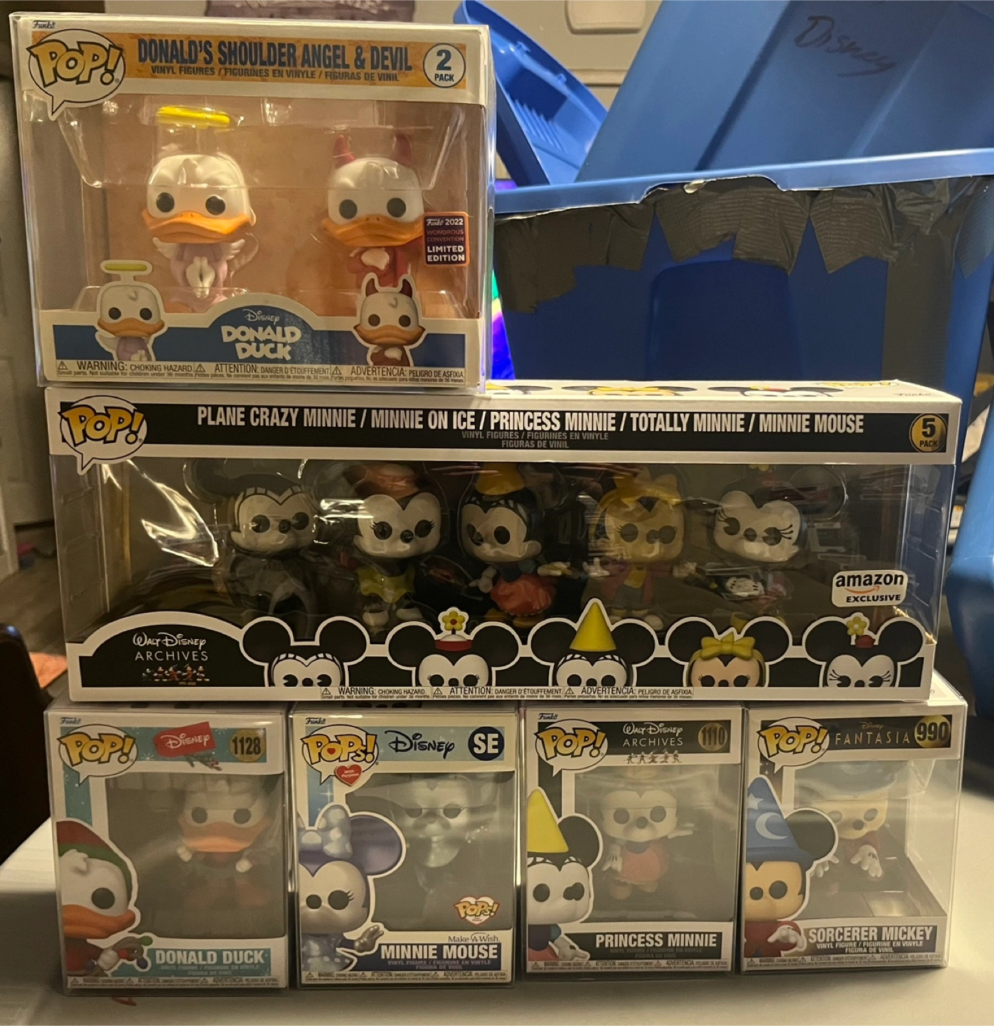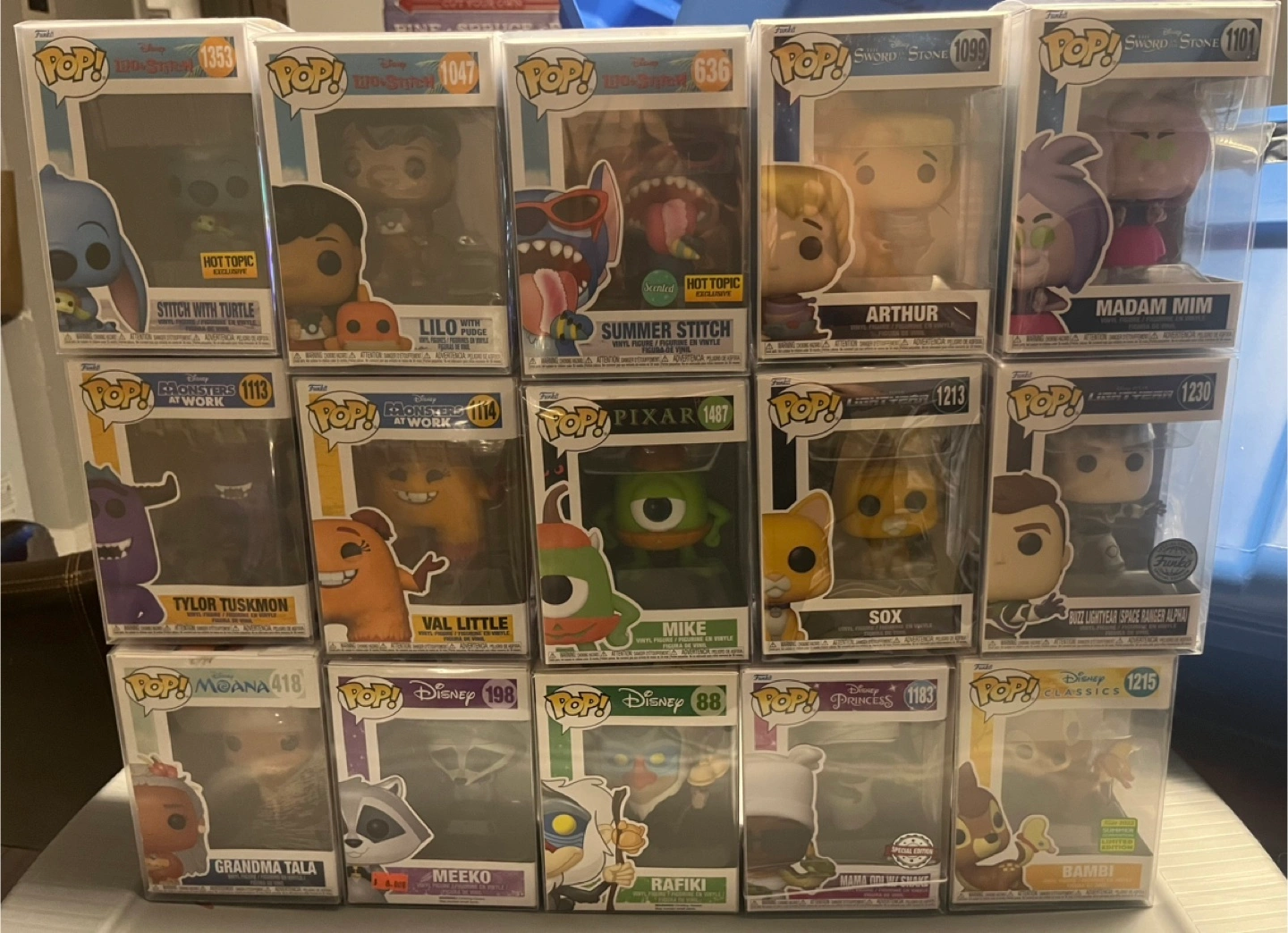 Selling a variety of Funko Pop! vinyl figures. These include characters from Disney, Pixar, and various movies. Great for collectors or anyone who loves these iconic characters! Each figure is in its original box. All Funkos come with pop protectors, never been opened, kept in storage and great condition. Open to offers BIG POP’s Moana (62) - $20 Goofy (105) - $30 Kronk N Yzma (1205) - $30 Mickey (107) - $30 Po (1526) - $40 Red Panda (1185) FLOCKED - $50 Ursula (1208) - $20 PRINCESSES Moana (1162) With funko pin - $20 Ariel/Jasmine/Rapunzel/Moana 4pack - $30 Brave (1245) - $10 Rapunzel N Pascel (147) - $15 Snow White (1019) - $10 VILLANS Ursula in cart (17) - $20 Evil Queen in cart (16) - $20 Captain Hook in cart (14) - $20 Cruella De Vil in cart (15) – 20 Cruella De Vil (1083) - $15 PINOCCHIO Pinocchio (1029) - $20 Jimmy Crickey (1228) - $ 15 NIGHTMARE BEFORE CHRISTMAS Sally (1243) - $20 Undersea Gal (601) - $ 10 Pumpkin Jack (1357) - $20 Santa Jack (72) - $20 UP/DUG DAYS Carl (1096) - $15 Dug N Squirrel (1092) - $10 Russel (1095) - $10 Ellie N Carl 2 Pack – $50 PETER PAN Tinker Bell (1198) - $25 Peter Pan N Pans Shadow 2 Pack - $25 WALL-E Wall-e N Eve 2 pack - $60 Wall-e (45) Rainbow - $ 10 Wall-e (1115) - $ 15 MICKEY MOUSE Donald Shoulder Angel & Devil 2 Pack - $50 Minnie Mouse 5 Pack - $ 30 Sorcerer Mickey (990) - $10 Princess Minnie (1110) - $10 Minnie Mouse (SE) - $ 10 Donald Duck (1128) - $10 Peter Pegasus (989) -$10 Goofy (409) - $10 Darkwing Duck (1328) - $50 SWORD AND THE STONE Madam Mim (1101) - $10 Arthur (1099) - $ 10 LILO AND STITCH Summer Stitch (636) Scented - $30 Lilo with Pudge (1047) - $20 Stitch with Turtle (1353) - $20 MONSTER INC Tylor (1113) - $5 Val (114) - $5 Mike (1487) - $ 10 LIGHTYEAR Buzz Lightyear (1230) - $10 Sox (1213) - $10 OTHER Encanto Bruno (1150) glow in dark - $ 10 Bambi (1215) - $10 Mama Odi with snake (1183) - $10 Rafiki (88) - $50 Meeko (198) - $40 Grandma Tala (418) - $15 Wreck-It-Ralph (30) 8-Bit -$20 Earth Giant (587) - $5 Quaildog (414) - $15 Quasimodo Fool (634) - $10 Cogsworth (1133) - $10 Zeus (593) - $10 Anger (136) - $50 Little John (1437) - $15 Professor Owl (1249) - $15 Sugar Mama with Puff (1175) - $10 Moonwind (746) - $5 Honey Lemon (108) - $15 Dumbo (729) DIY - $10 Flounder (237) - $40 White Rabbit (1062) - $20 Kronk (1223) - $20 Eeyore (1131) - $20