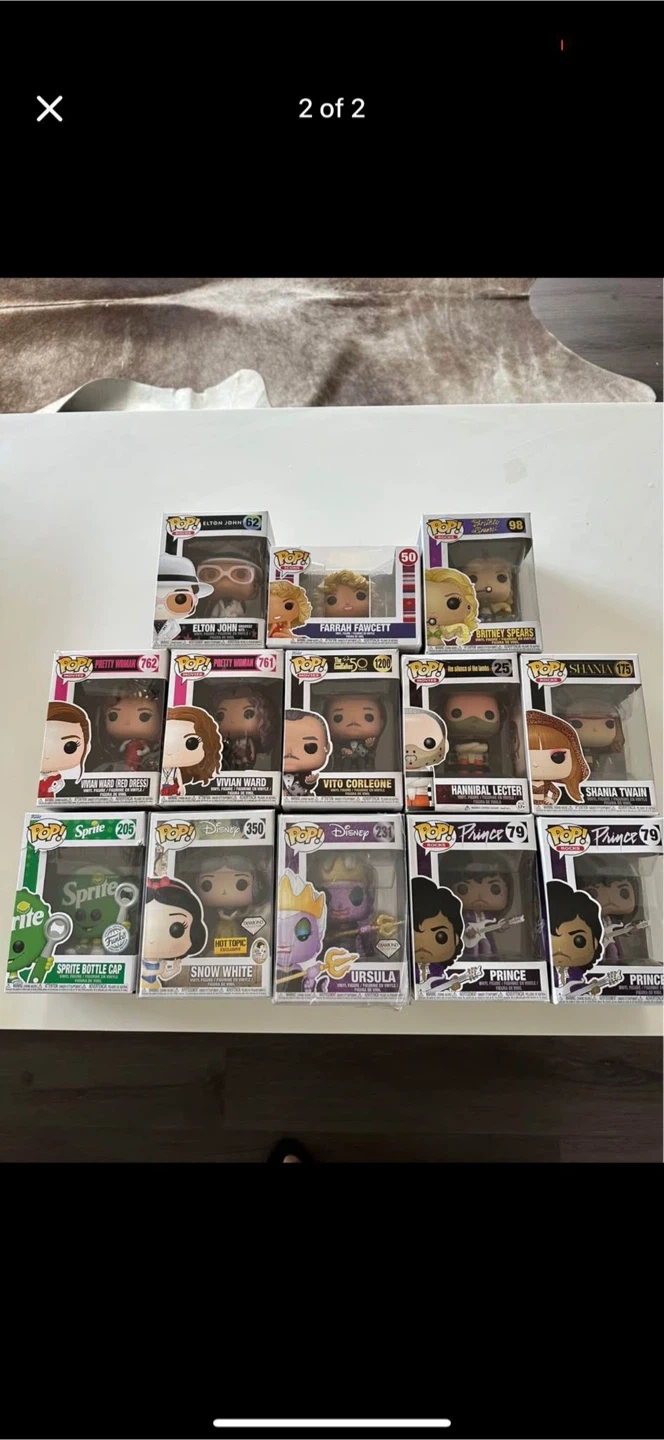 Selling a variety of Funko Pop! vinyl figures, including: - Elton John #62 - Britney Spears #98 - Vivian Ward (Red Dress) #762 - Vivian Ward #761 - Vito Corleone #50 - Hannibal Lecter #25 - Shania Twain #175 - Sprite Bottle Cap #205 - Snow White #350 - Ursula #231 - Prince #79 All figures are in their original boxes. Great for collectors!