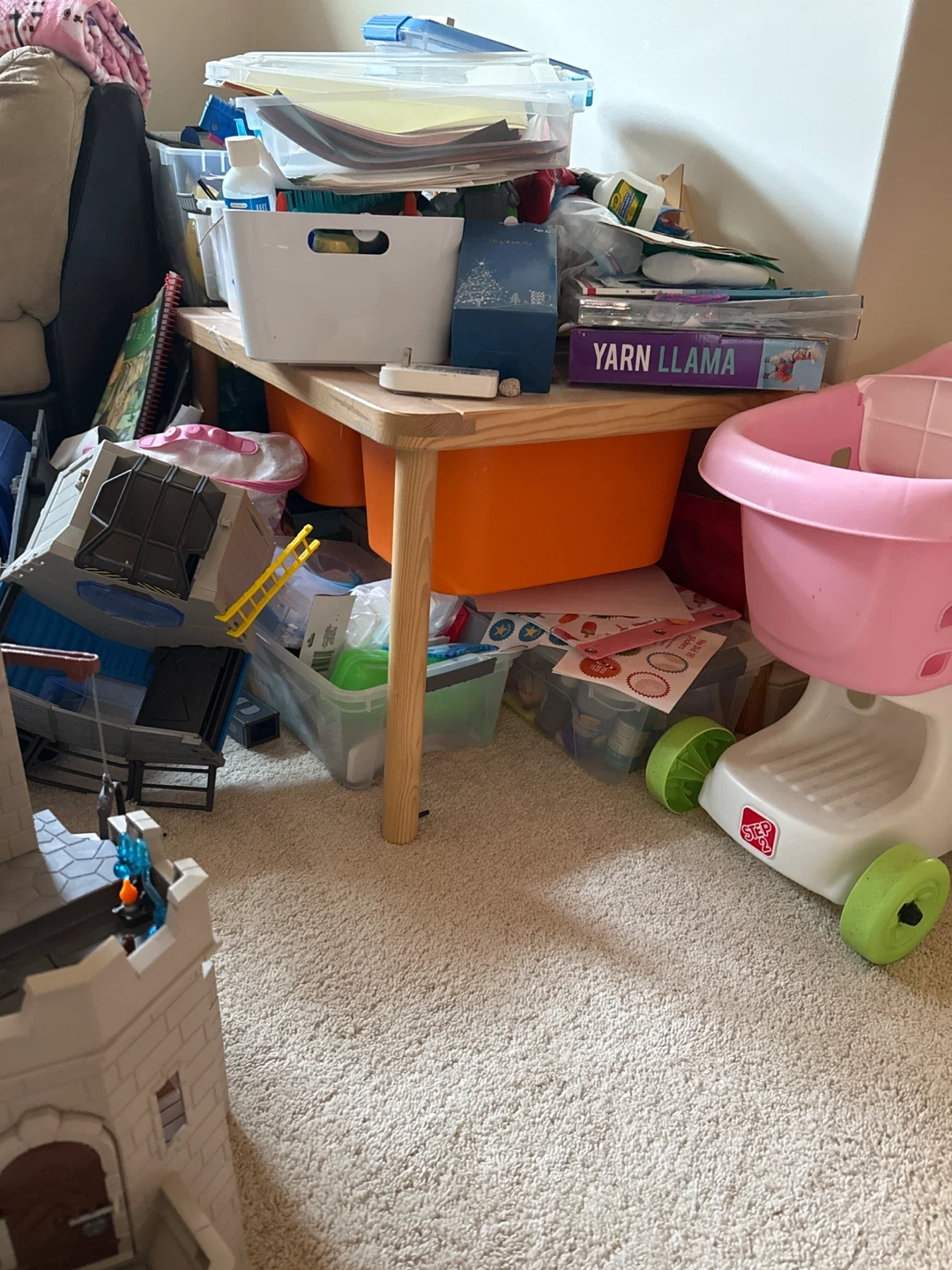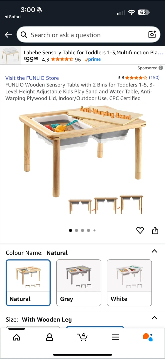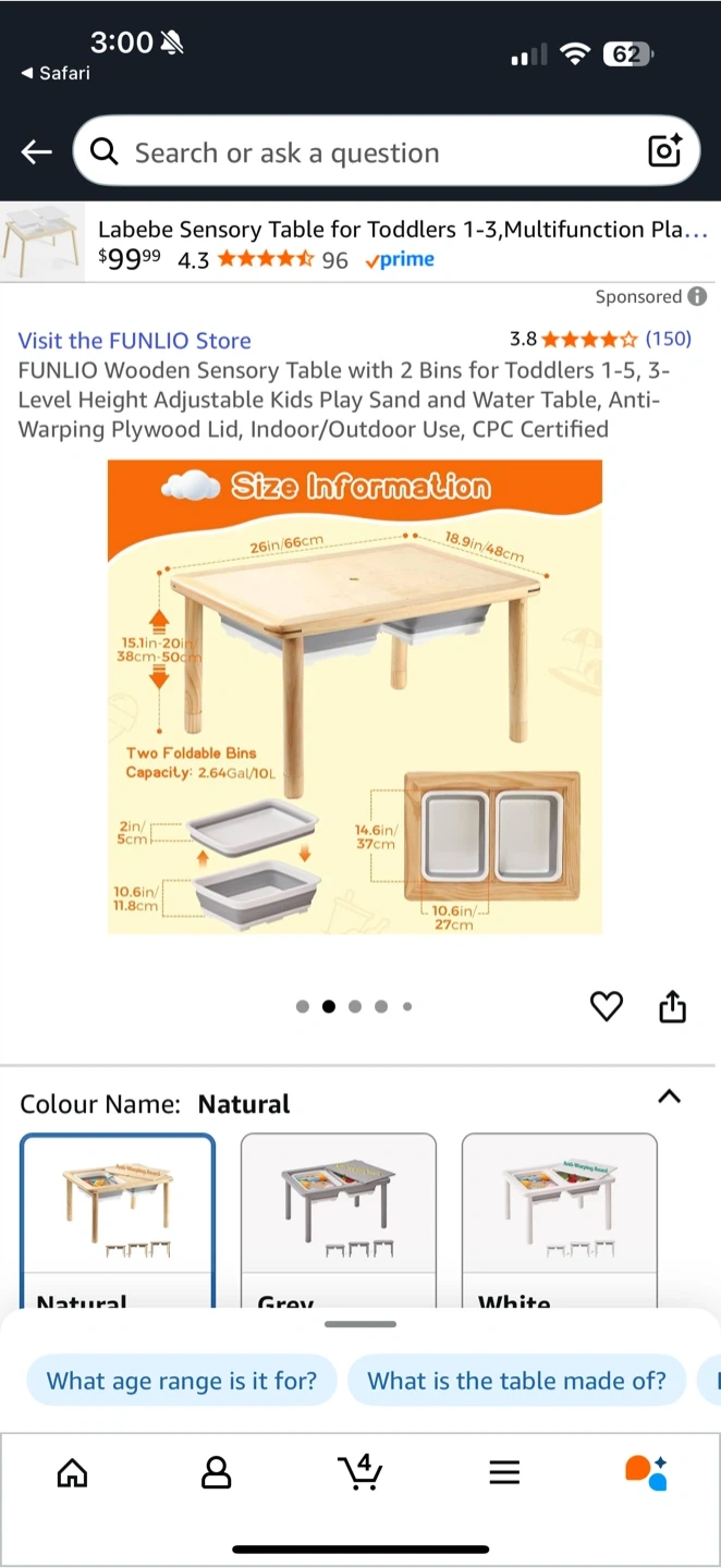 Selling wooden activity table perfect for toddlers aged 1-5! This table features two bins and It's great for kids to play with sand and water, and has an anti-warping plywood lid. The size information shows dimensions of 26in/66cm and 18.9in/48cm. The bins have a capacity of 2.64Gal/10L. Colour is natural. Also comes with small chair