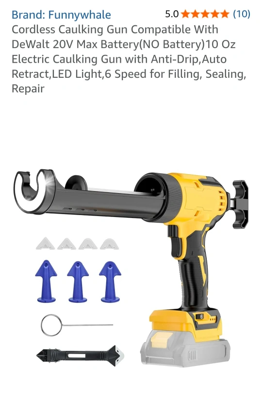 Selling a Funnywhale cordless caulking gun, compatible with DeWalt 20V Max batteries (battery not included). This electric caulking gun features anti-drip, auto-retract, an LED light, and 6 speeds for filling, sealing, and repair