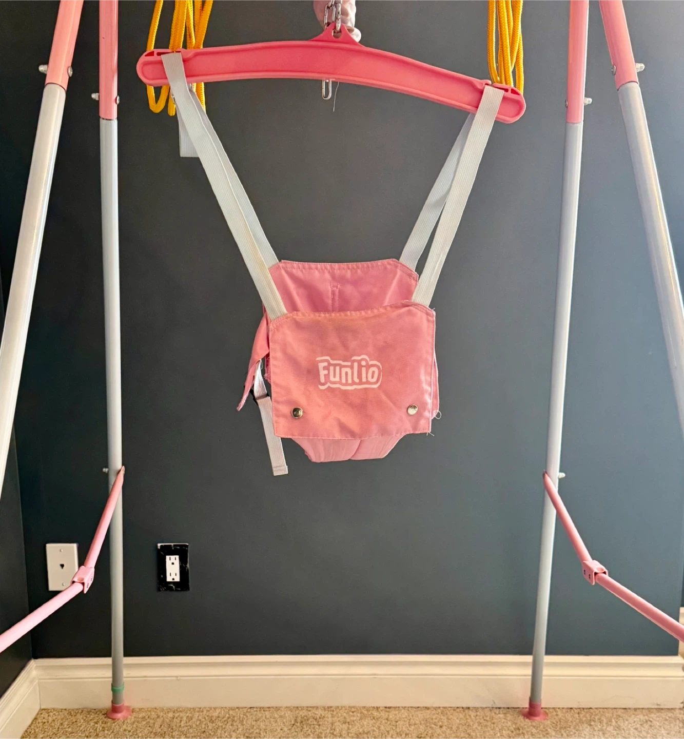 This is a gently used Funlio baby swing set, perfect for little ones! It features a sturdy pink frame with a comfortable seat and safety straps. Great for indoor or outdoor fun!