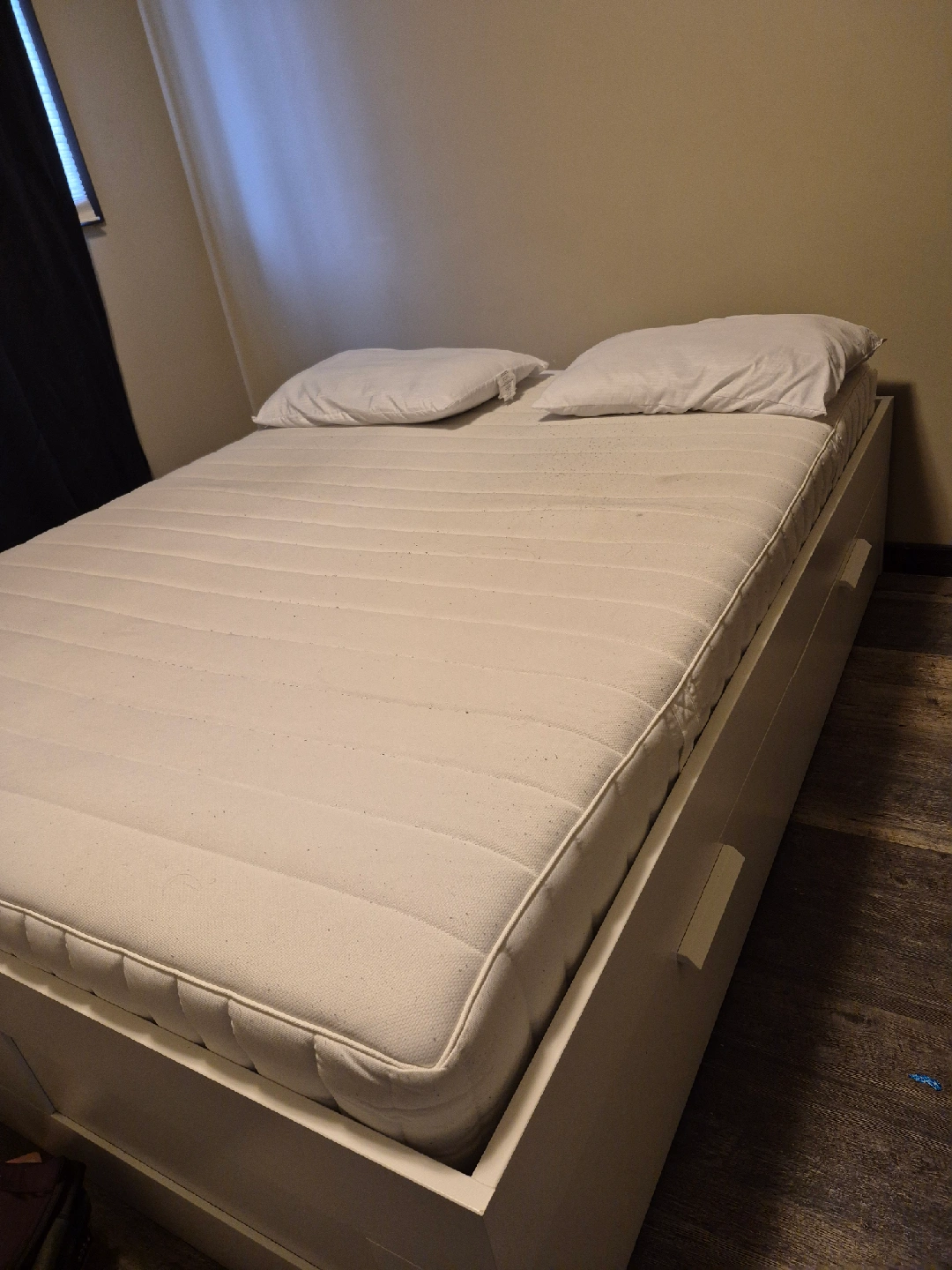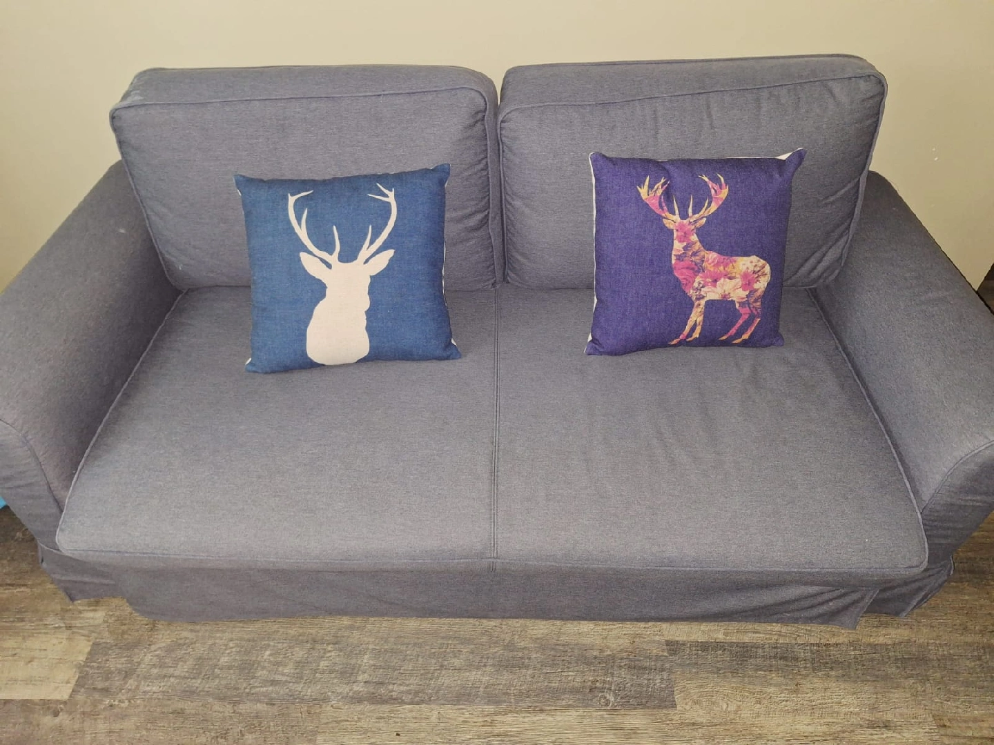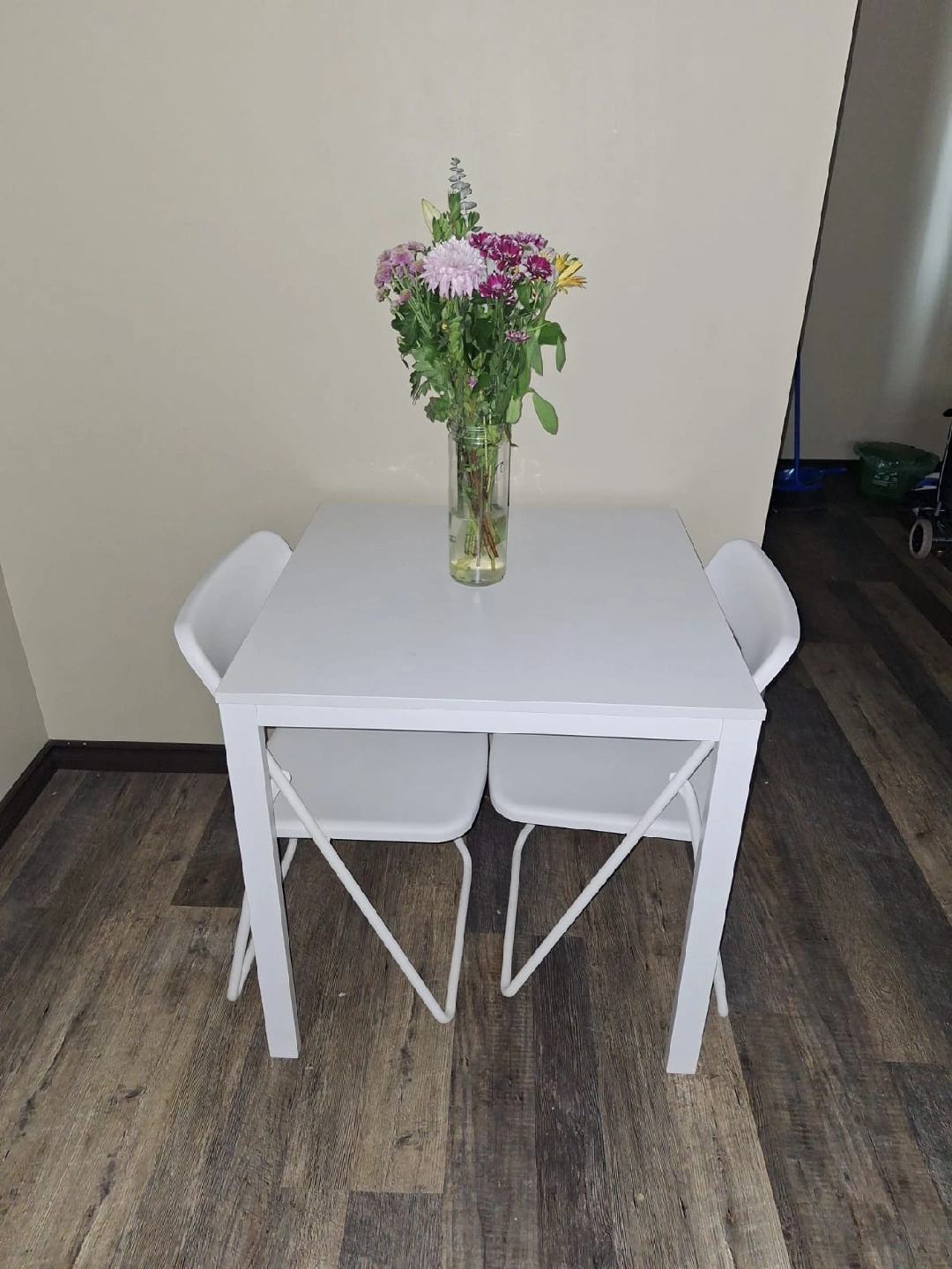 Selling a furniture bundle that includes a black desk, a bed, a white table with chairs, and a grey sofa. All items are in good condition and ready to find a new home!
