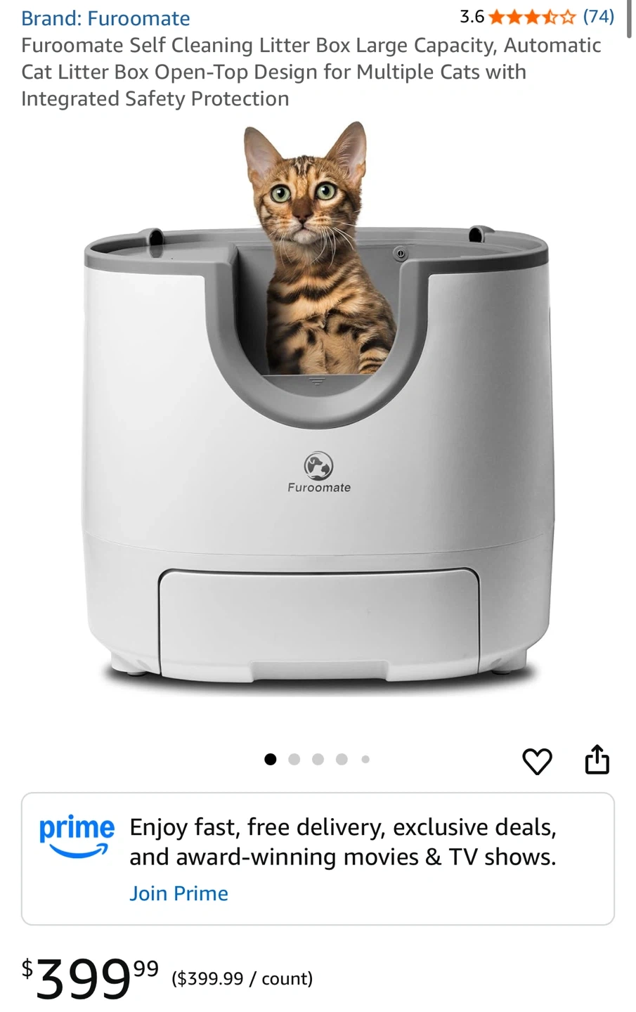 Selling a Furoomate self-cleaning litter box. It's designed for multiple cats and has an open-top design. This automatic litter box has integrated safety protection. Comes with the box!