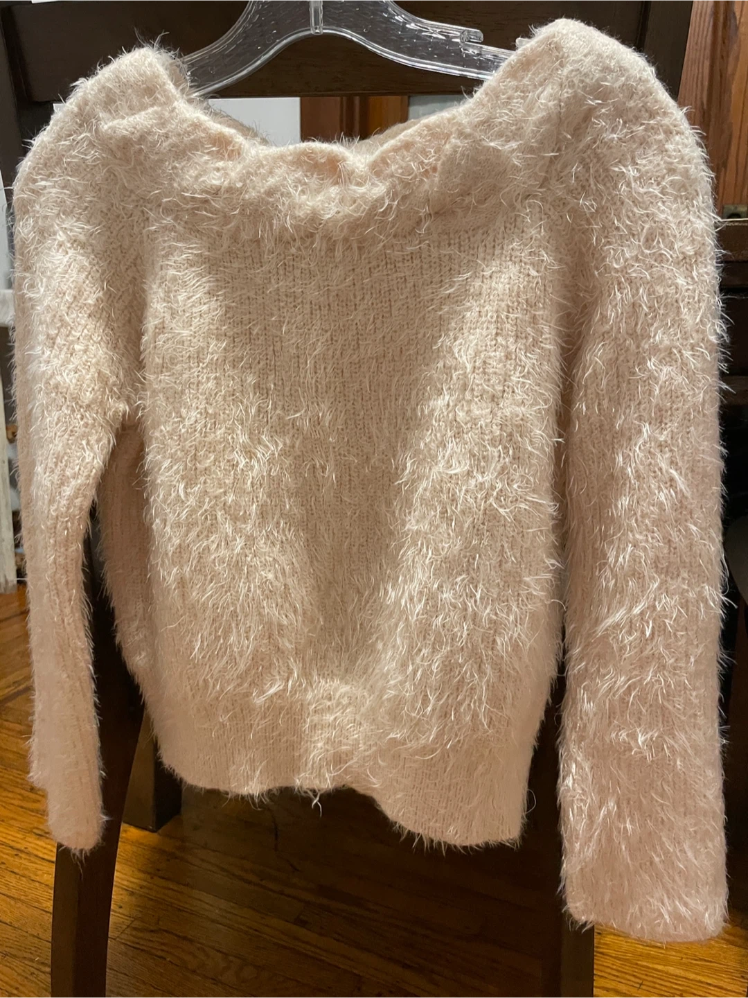 Cozy up in this fuzzy knit sweater! It's a size small and perfect for adding a touch of warmth and texture to your outfit. The material is soft and comfortable, making it ideal for chilly days