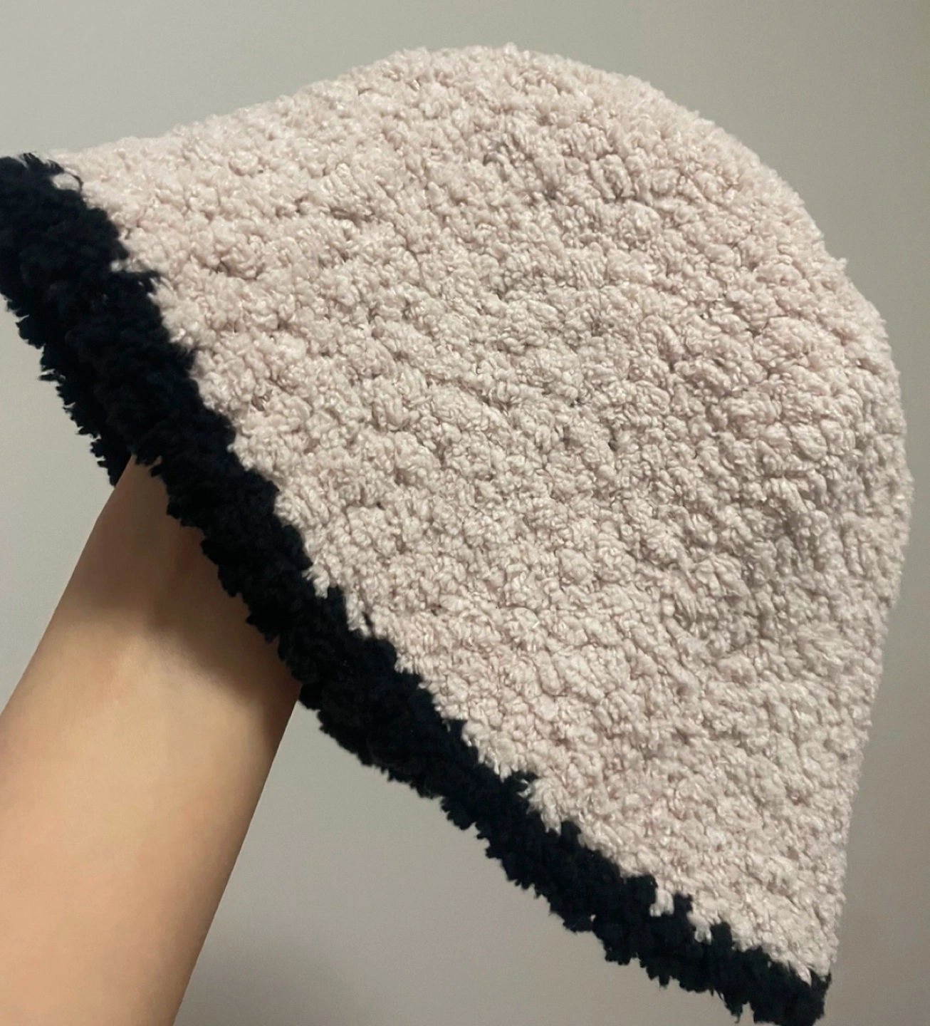 Soft bucket hat. Pink fuzzy material with black trim. One size fits most.