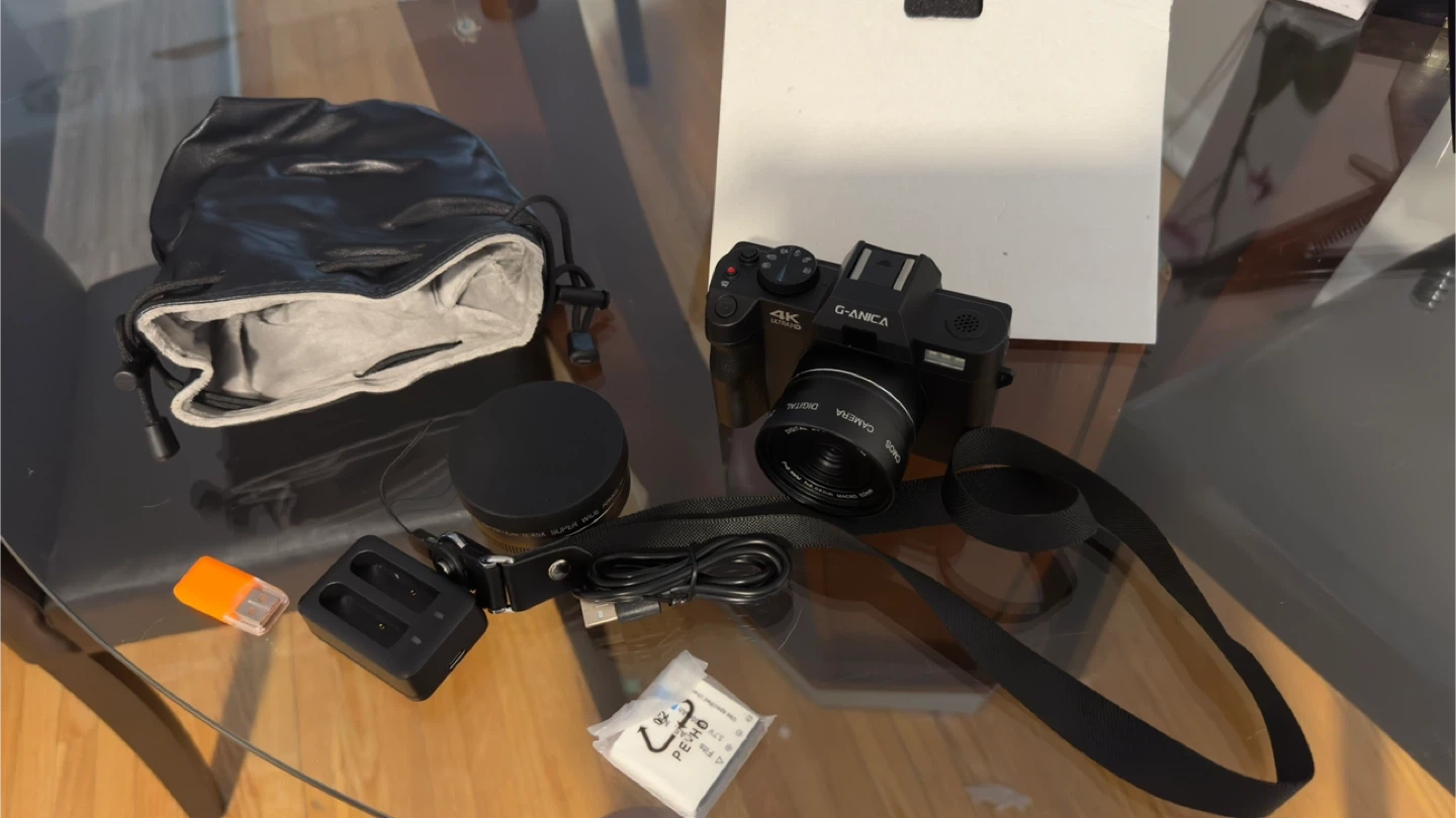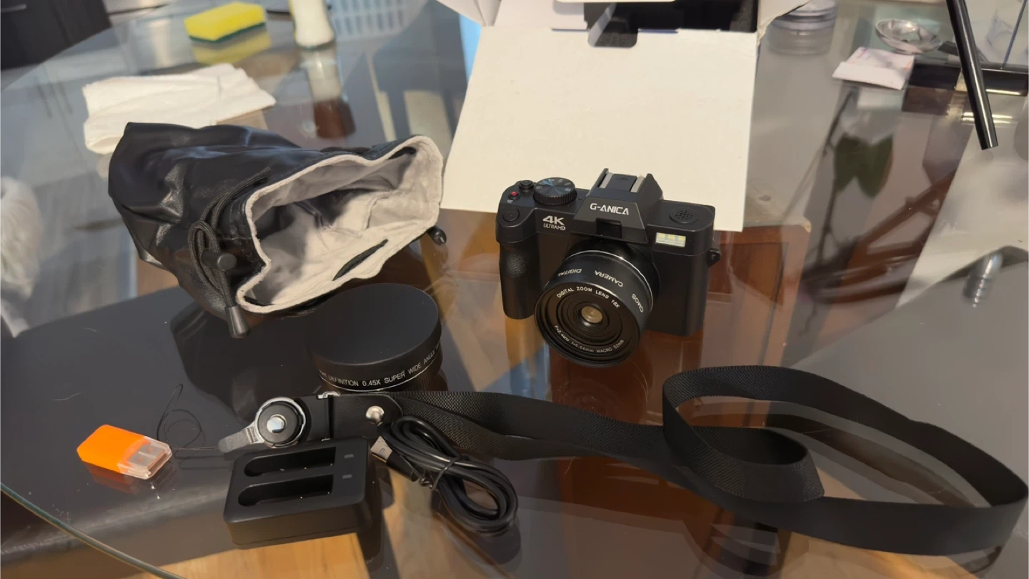 Selling a G-ANICA 4K digital camera. It comes with its original box and accessories, including a lens, strap, charger, and camera bag. The camera boasts features like 48MP, 16X digital zoom, HDR mode, wide-angle lens, autofocus, and an LED fill light. Great for capturing memories!