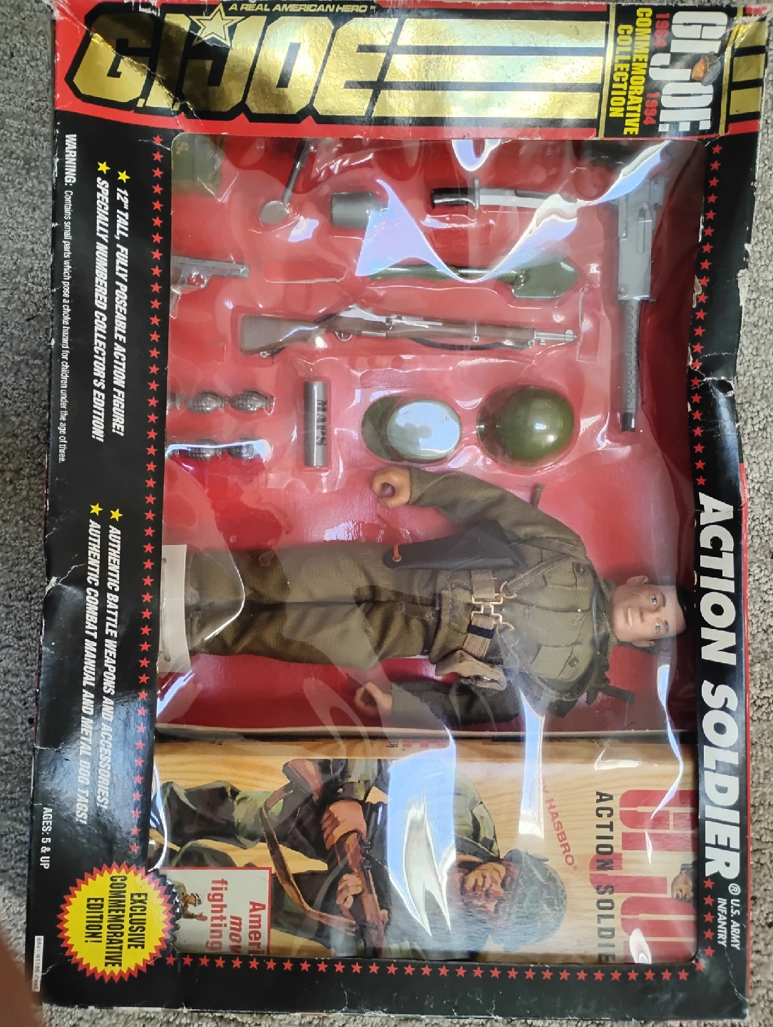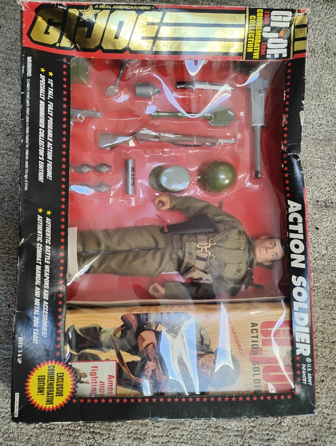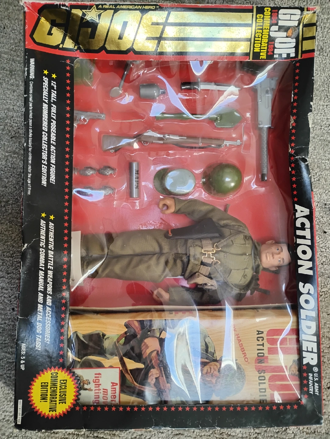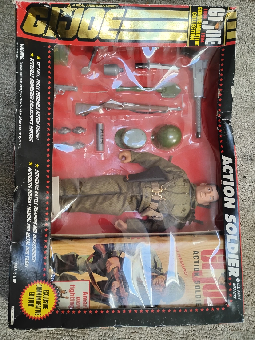 Selling a G.I. Joe 1994 Commemorative Collection Action Soldier. This is a 12" fully poseable action figure and a specially numbered collector's edition! Authentic battle weapons and accessories included, along with the authentic combat manual and metal dog tags. Ages 5 & up rare vintage retro all parts new