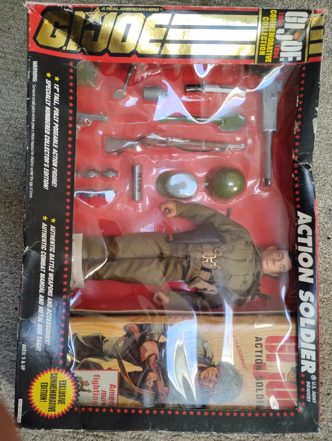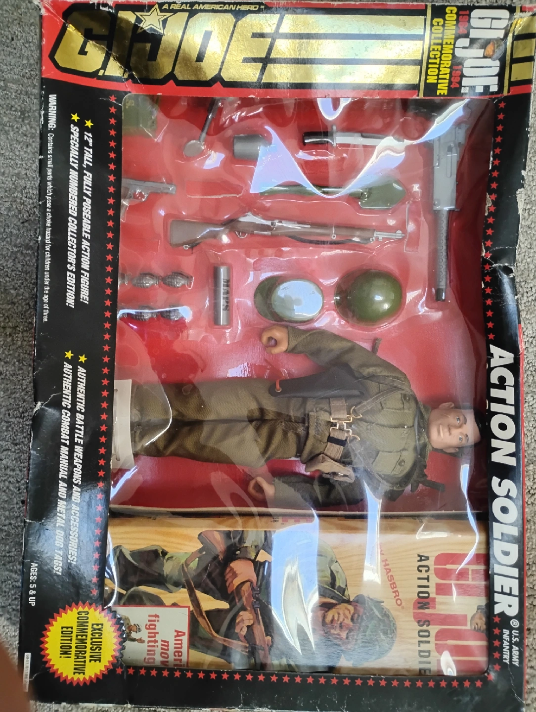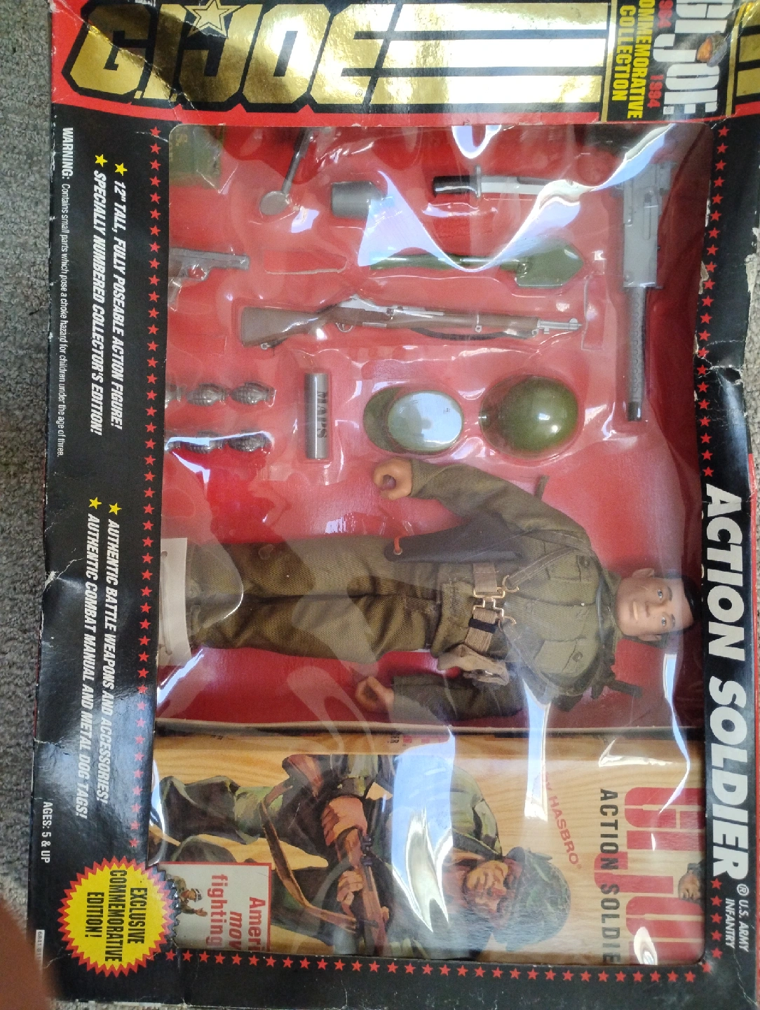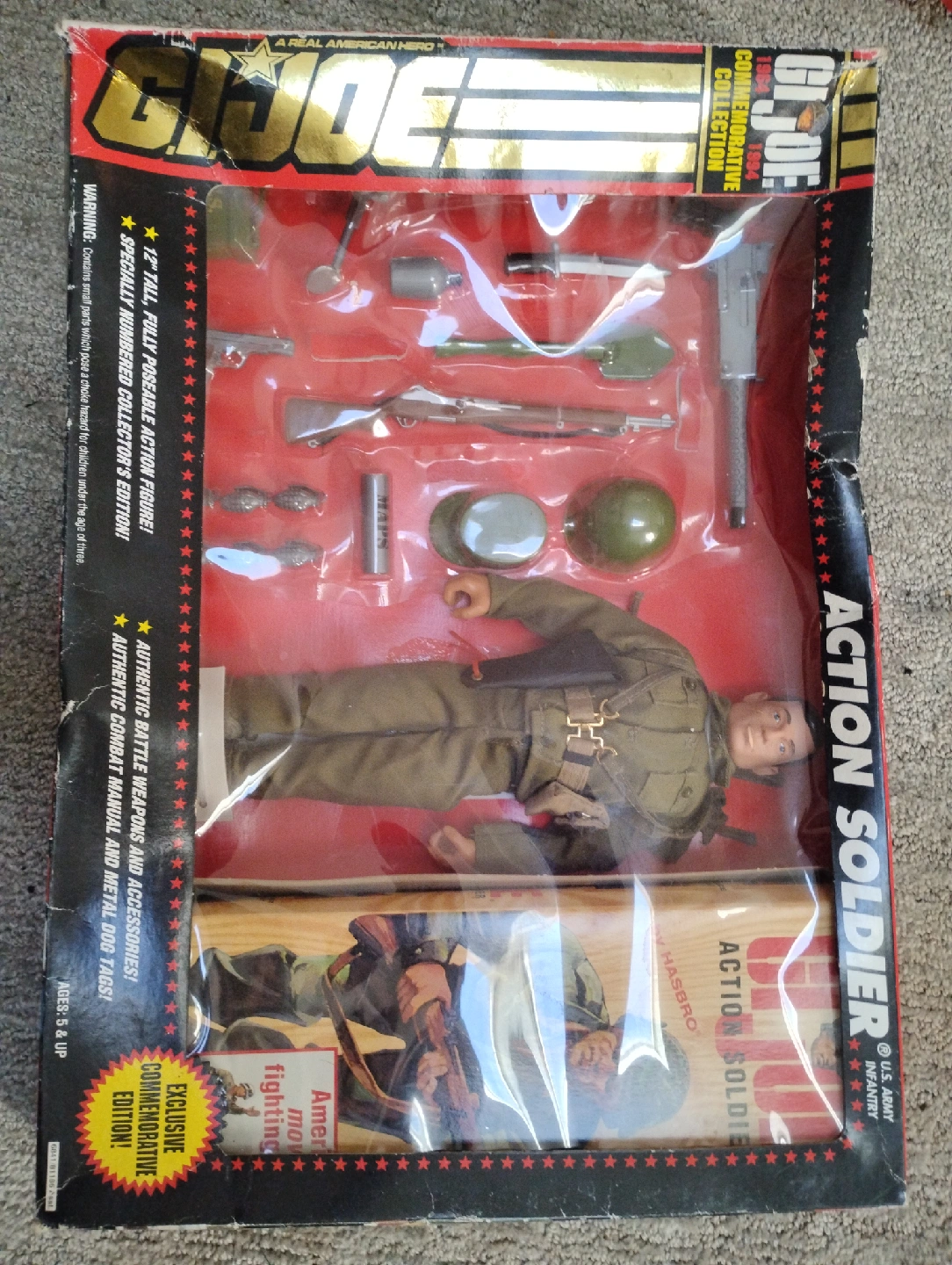 Selling a G.I. Joe 1994 Commemorative Collection Action Soldier. This is a 12" fully poseable action figure and a specially numbered collector's edition! Authentic battle weapons and accessories included, along with the authentic combat manual and metal dog tags. Ages 5 & up rare vintage retro all parts new