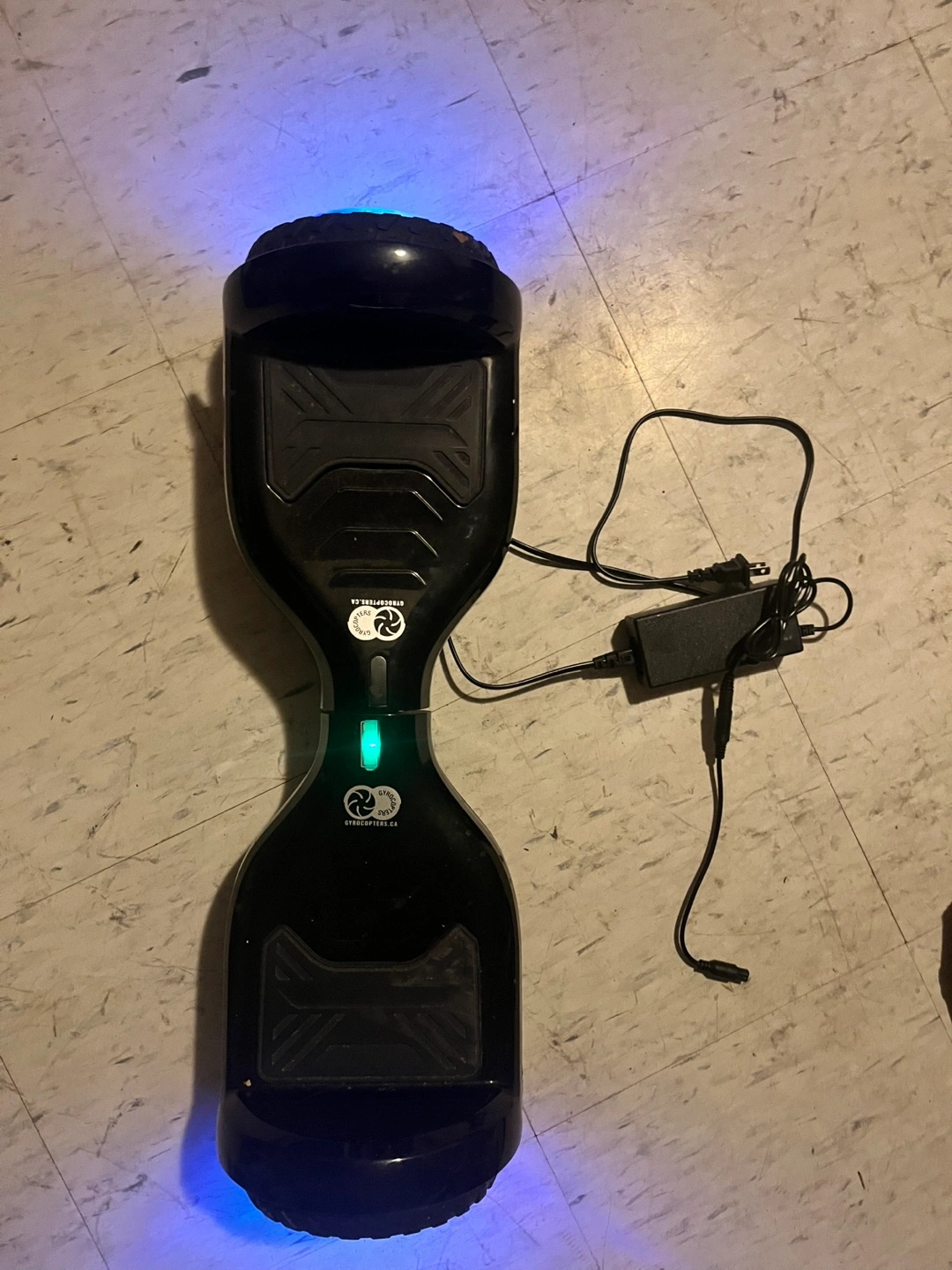 Black hoverboard with light-up wheels, Bluetooth and self-balancing. ($220brand new) includes brand new-in-box go-cart seat attachments. ($110) The hoverboard is in good condition, with some minor wear. Only used inside. Charger included. Max speed 7.4MPH. Model number EL-ES12