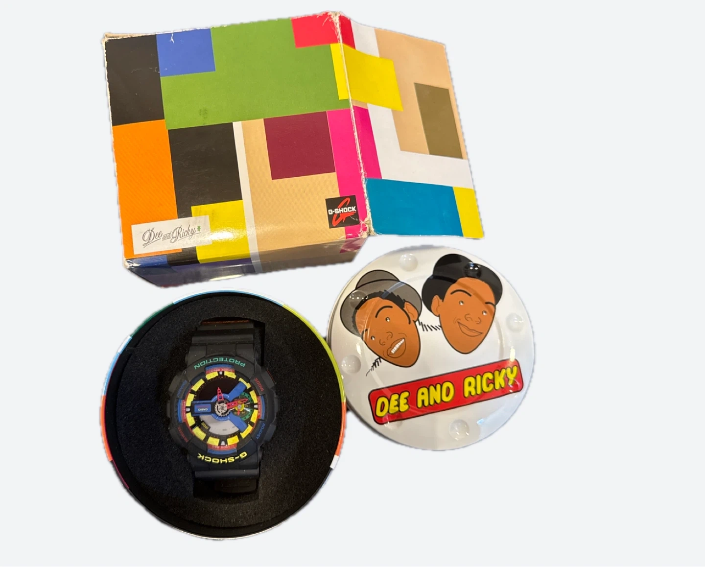 Selling a G-Shock watch from a collaboration with Dee and Ricky! It comes with its original box and case. Needs a new battery but is fully functional and barely worn. A fun and unique timepiece to add to your collection!