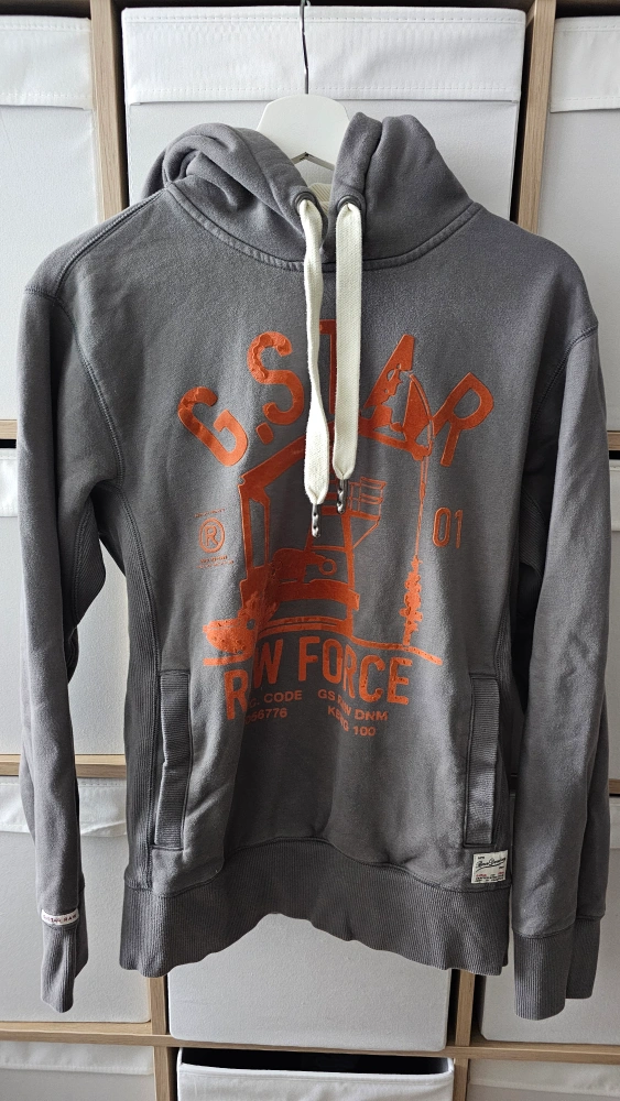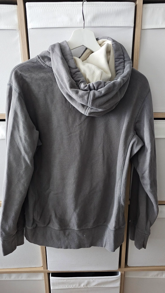 Grey hoodie. Features a hood and drawstring. Contains a large print on the front. The perfect garment to cozy up in on a chilly day.