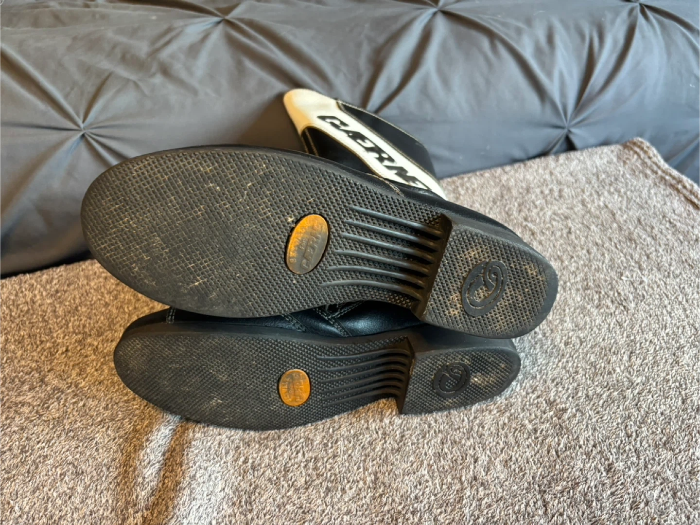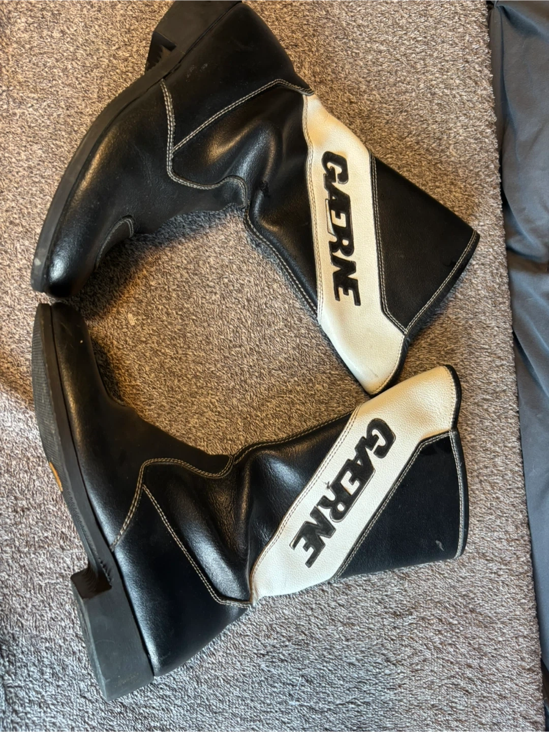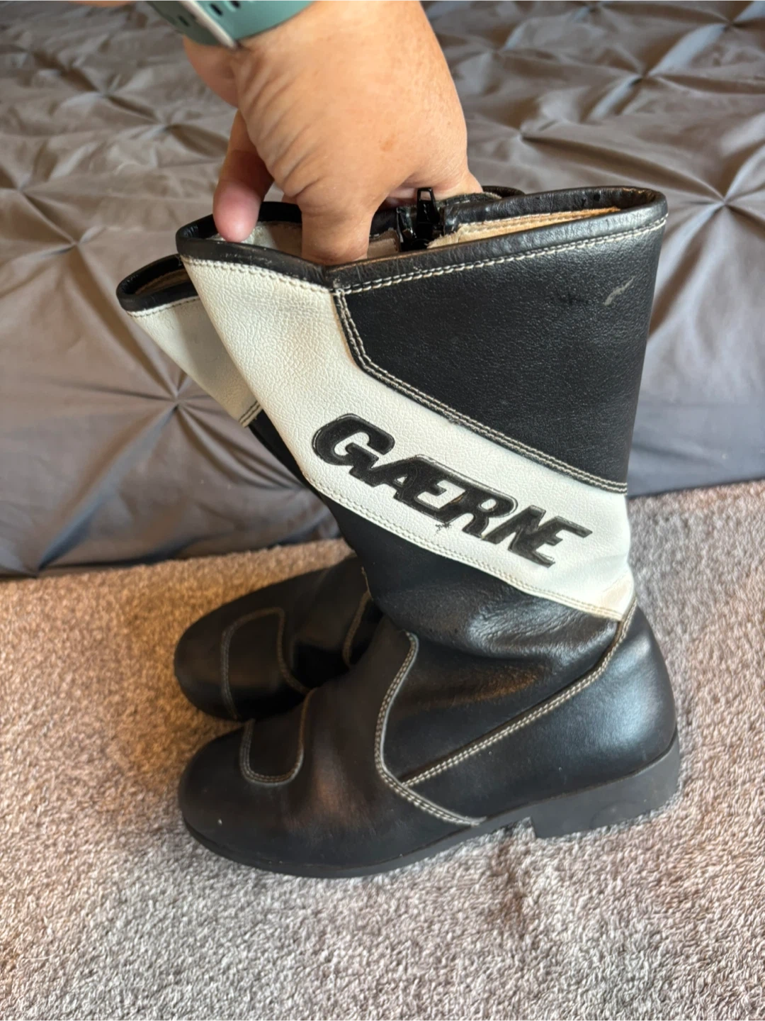Selling a pair of Gaerne boots in black and white leather. Double closure They're in excellent condition and are a size 6. Made in Italy!