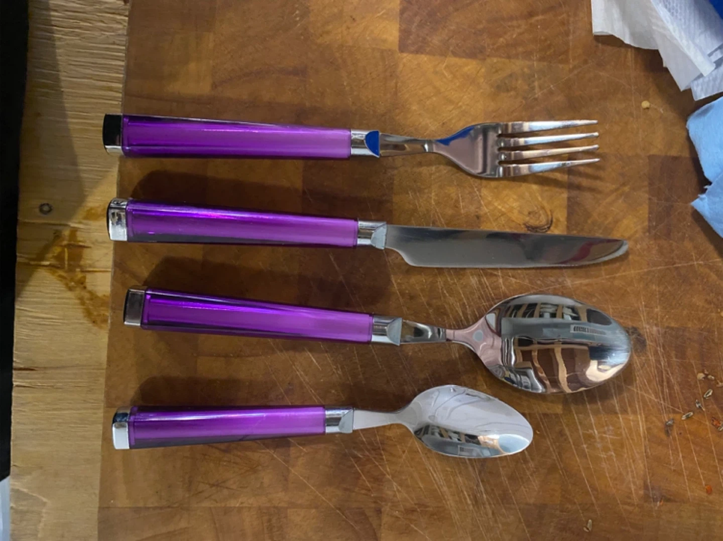 Selling a set of Galileo Casa cutlery with a vibrant purple handle imported from Italy. This set includes 8 forks, 8 knives, 8 tablespoons, and 8 teaspoons. They've never been used.