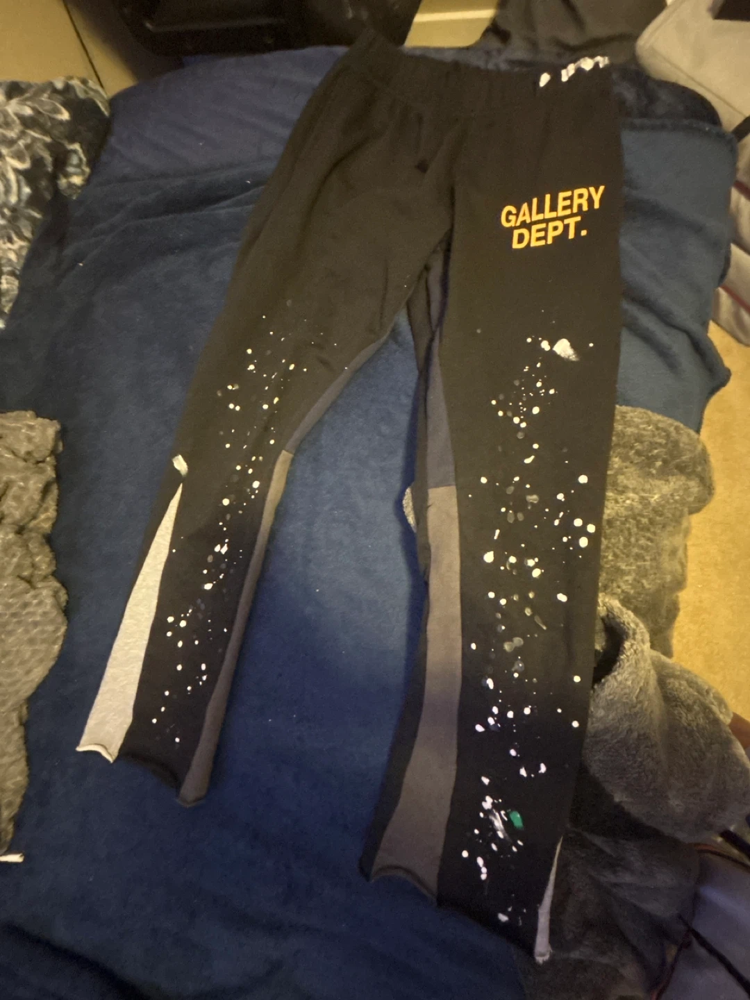 Selling a pair of Gallery Dept. black sweatpants. They feature a cool paint splatter design and grey side panels. Perfect for a casual, stylish look!