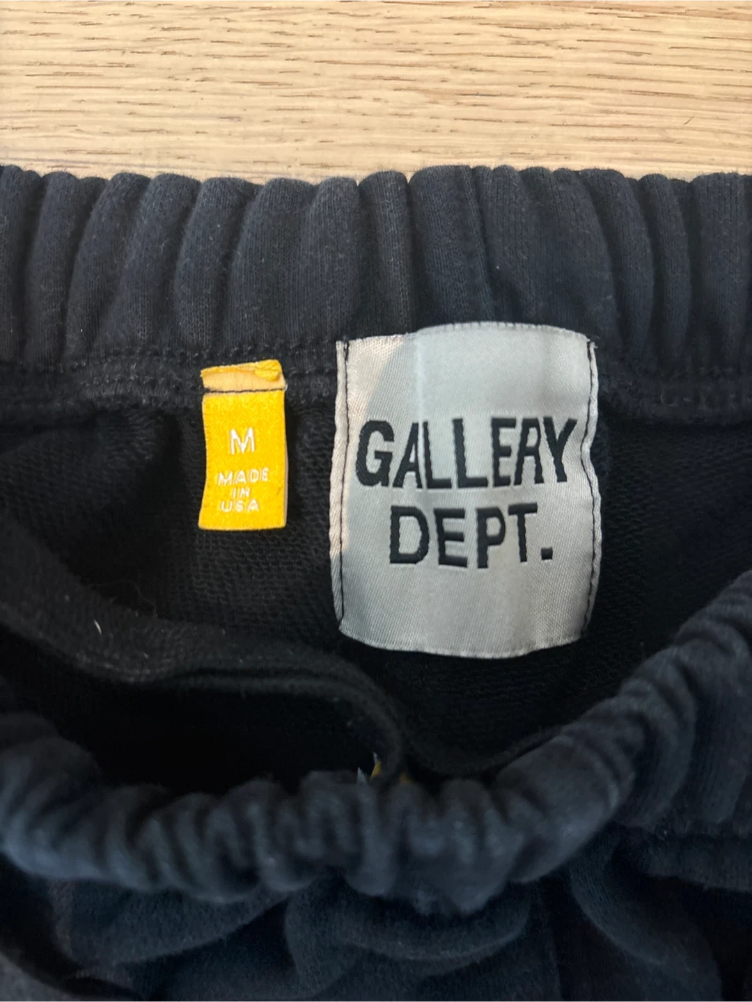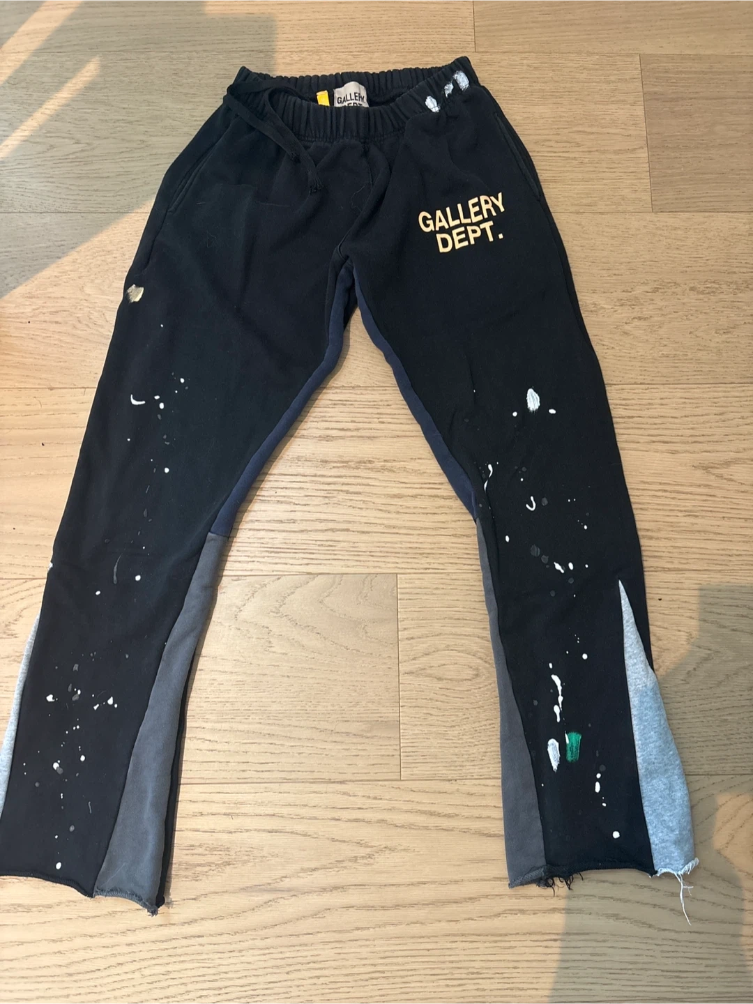Selling a pair of Gallery Dept. sweatpants in size medium. They're black with a unique design and in good condition. Perfect for a casual, stylish look! For is small - prob good for aprox 100 lb child/teen