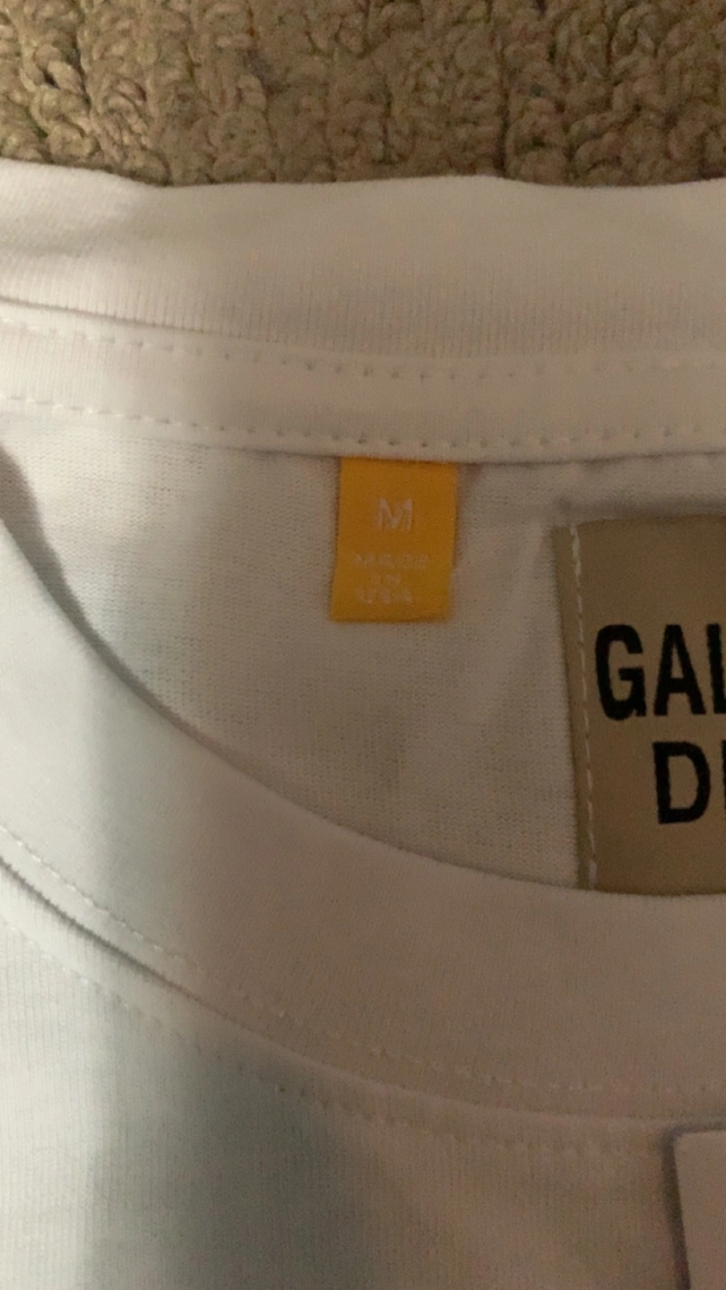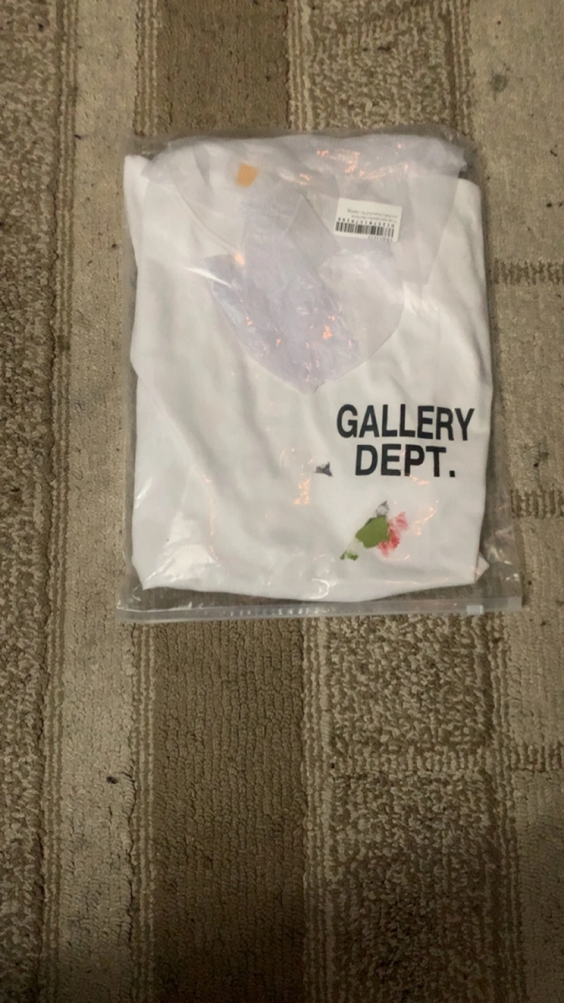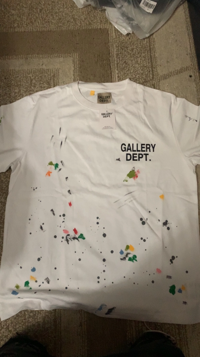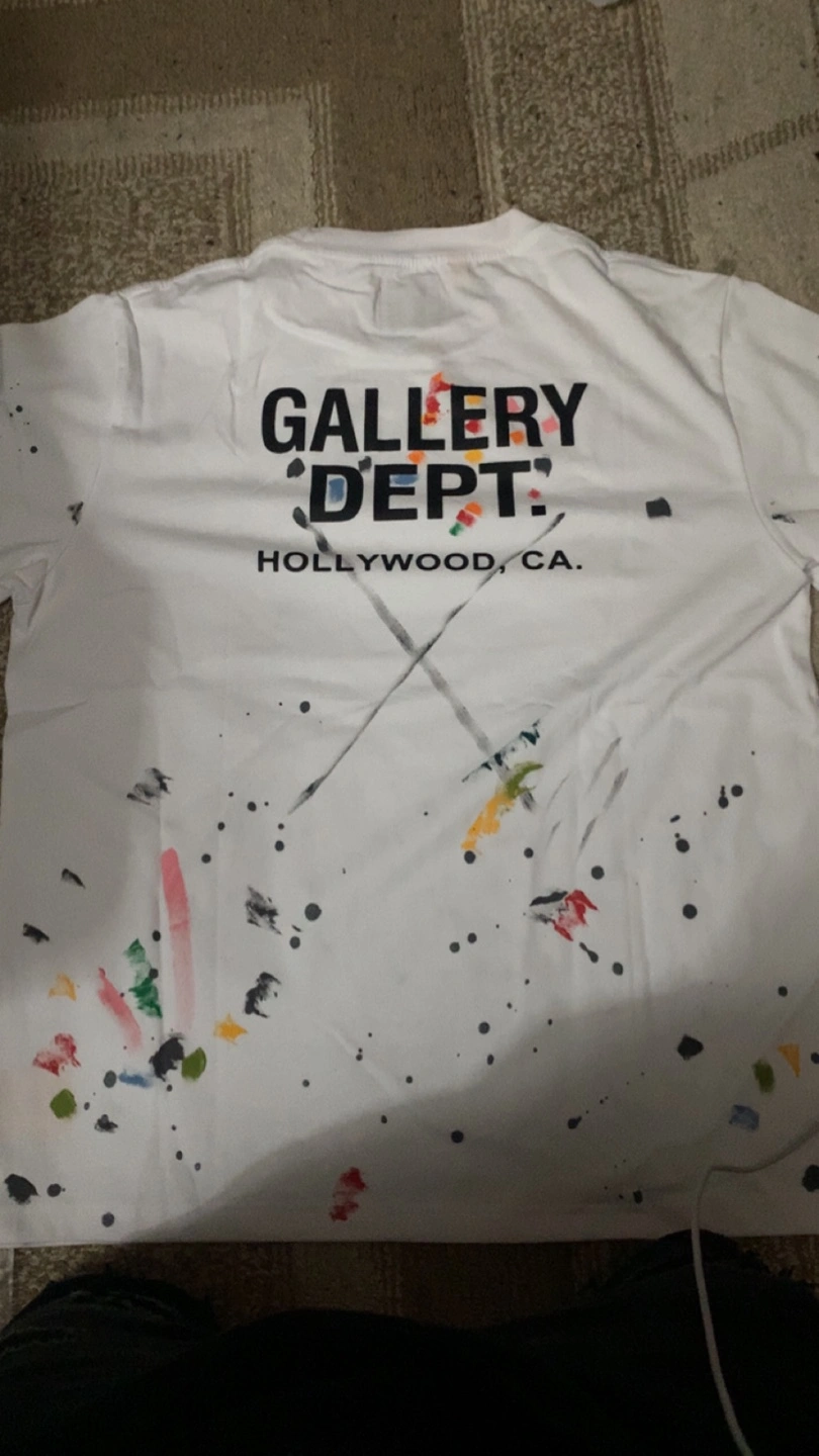 Selling a Gallery Dept. white t-shirt in size medium. It features the brand's logo on the front and back, with a unique paint splatter design. This tee is perfect for adding a touch of artistic flair to your wardrobe!