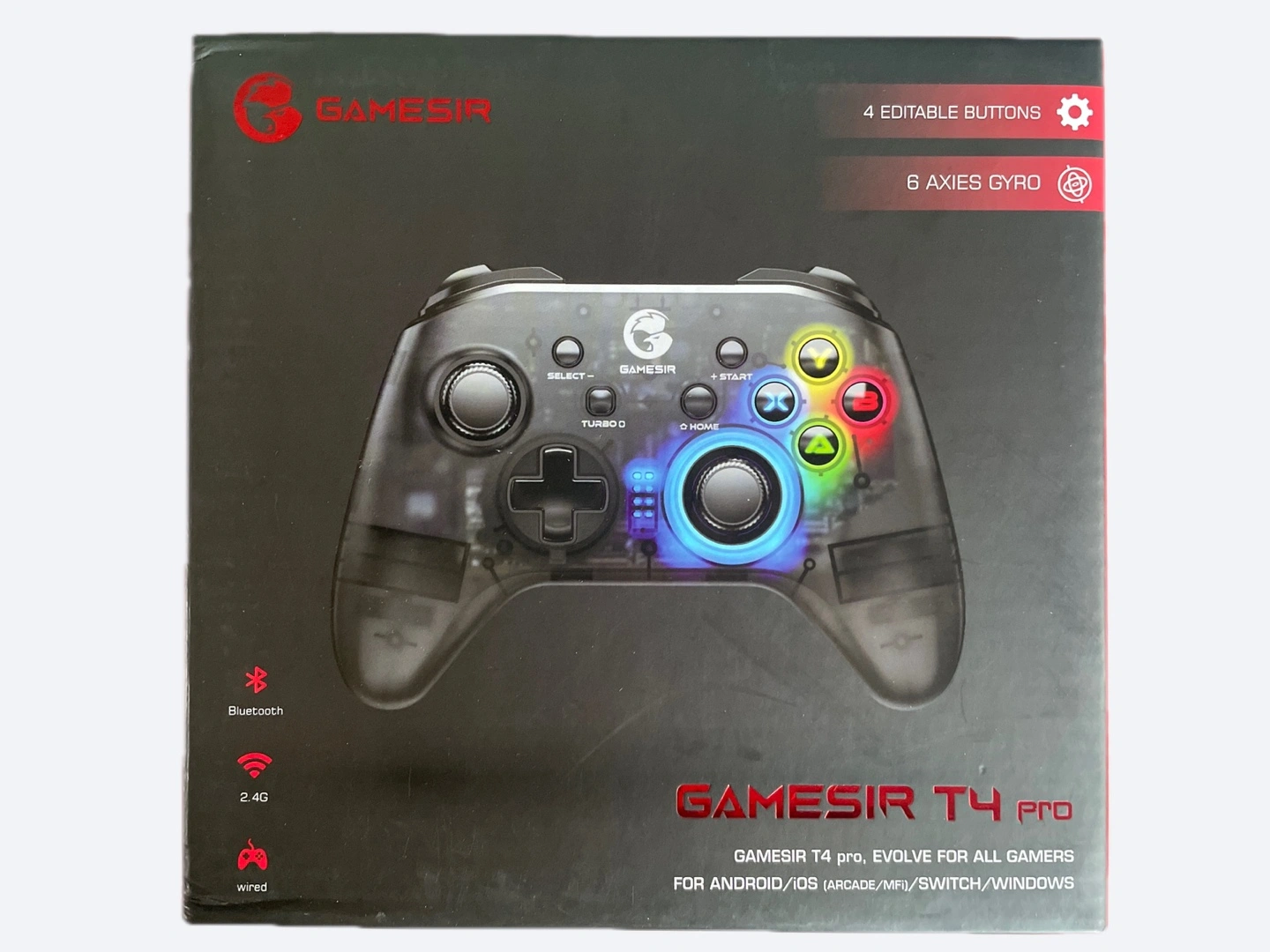 GameSir T4 Pro controller in excellent condition! It's compatible with Android, iOS, Arcade, MFi, Switch, and Windows devices. - Features 4 editable buttons and 6-axis gyro for precise control - Supports Apple Arcade and MFi games - Has 4 customizable buttons for personalized configurations - Features LED lights in a transparent T4 Pro body - Wired connection via the standard Type-C interface Comes with the original box and all included components! Gamer Electronic