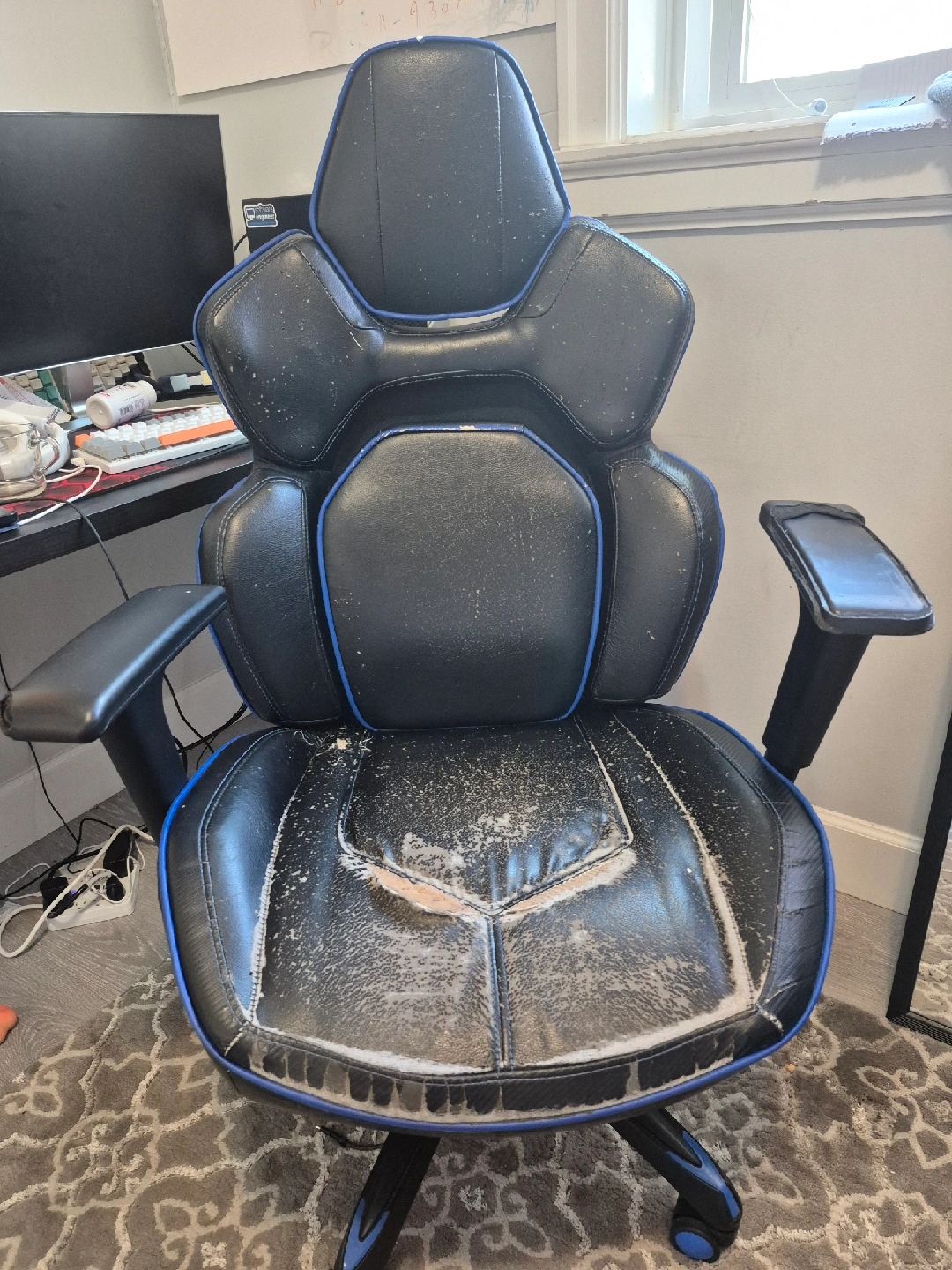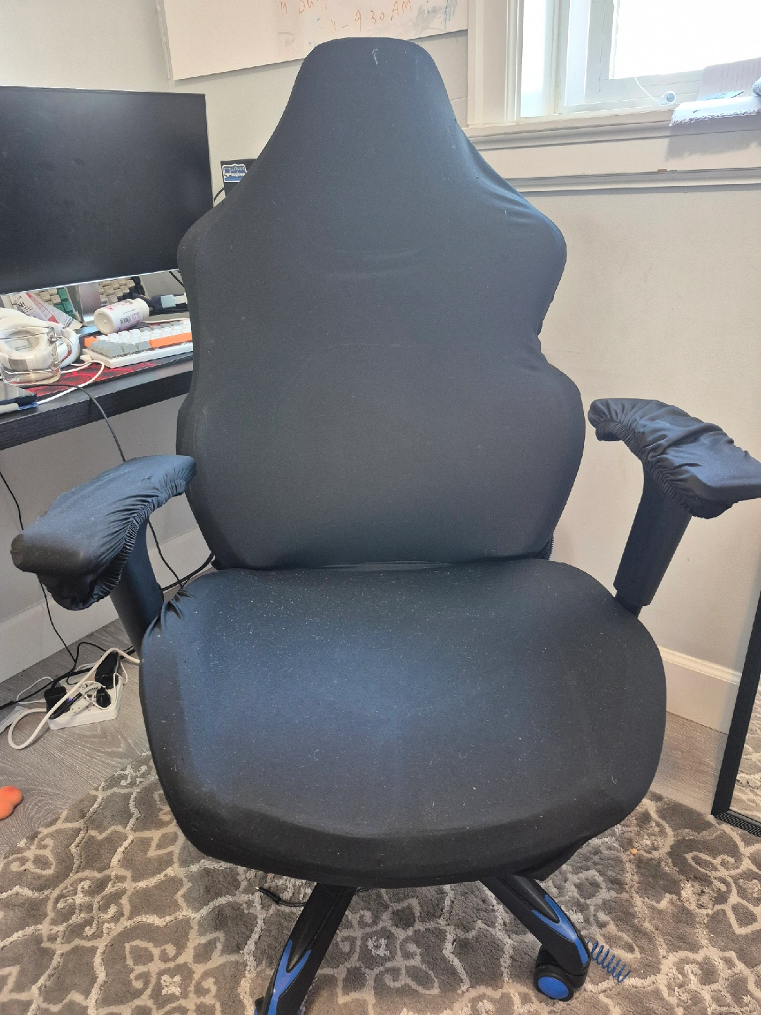 Selling a used gaming chair. It has some wear and tear, as you can see in the photos, but I've put a cover on it so it's still comfy and functional. Perfect for someone looking for a budget-friendly option!