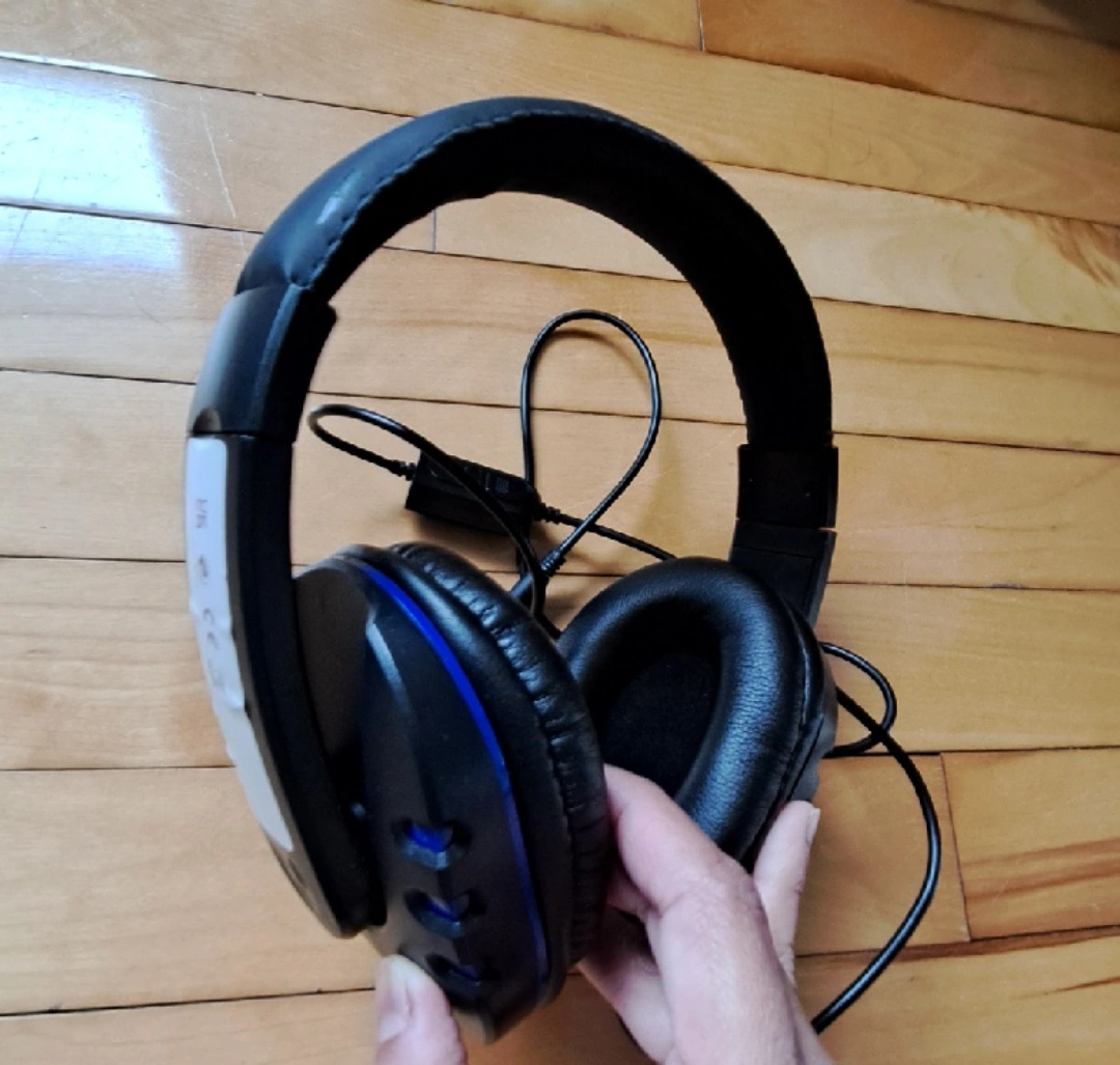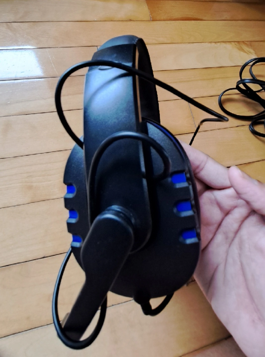 Selling a used gaming headset. It's black with blue trim and has a microphone attached. Great for gaming or online meetings!