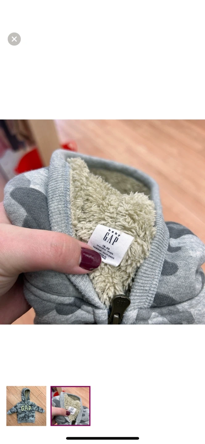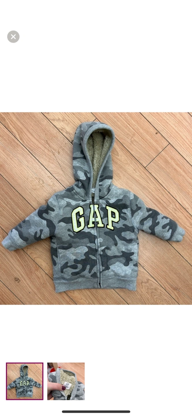 Gap brand. Sherpa lined zip up sweater. Grey camo with neon green gap logo. Size 18/24m. Brand new condition $8 Pickup between kincardine & ripley or I can arrange delivery in port Elgin-Owen sound, walkerton-Durham, wingham-listowel-kw/cambridge, goderich-bayfield, Woodstock & Arthur-Orangeville-Newmarket-Lindsay-Peterborough AREAS.