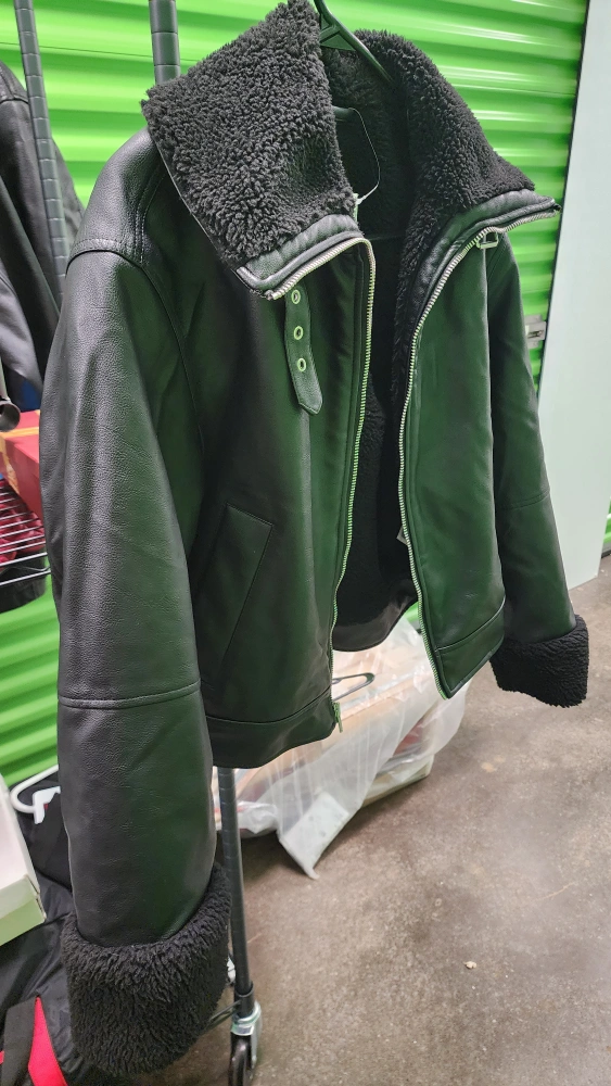 Cozy up in this stylish GAP black faux leather jacket! It features a soft sherpa lining and a sleek design. The jacket is size SP. The lining is made with 30% recycled polyester.