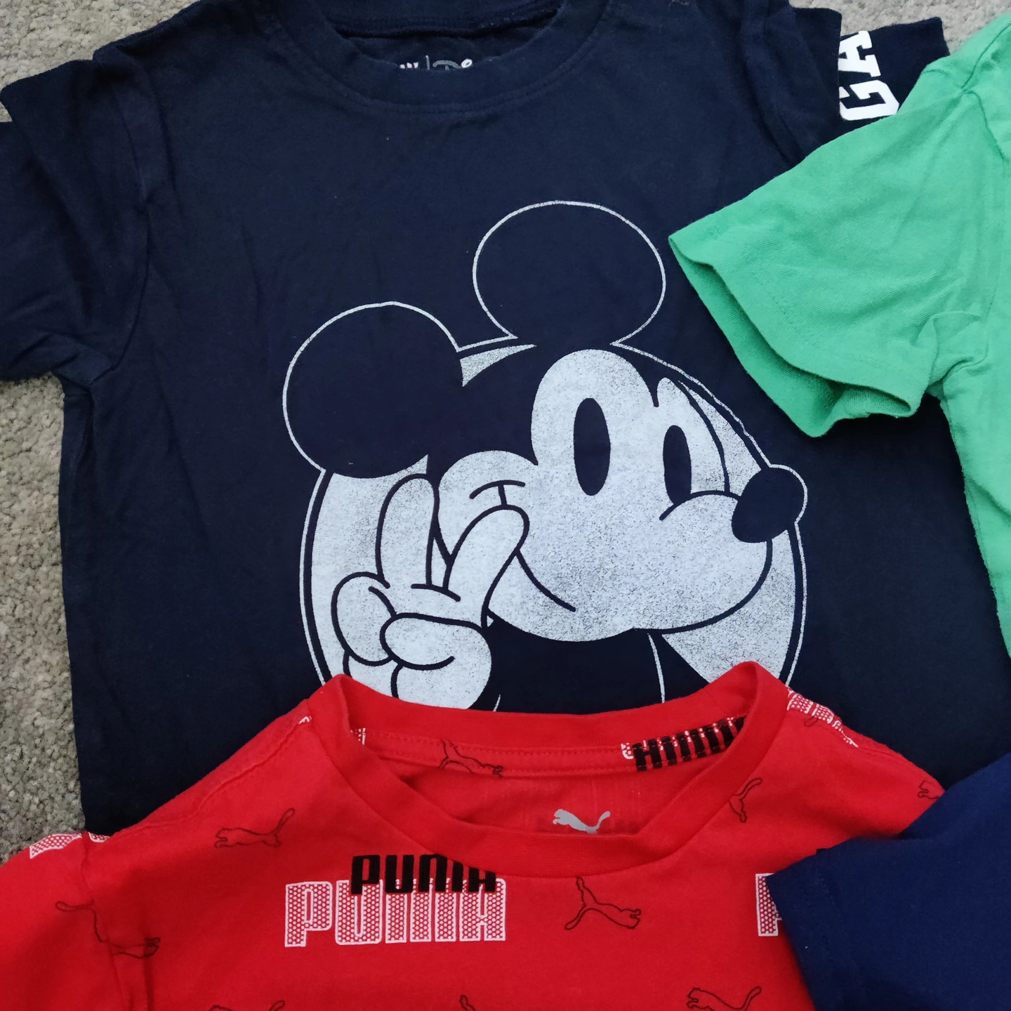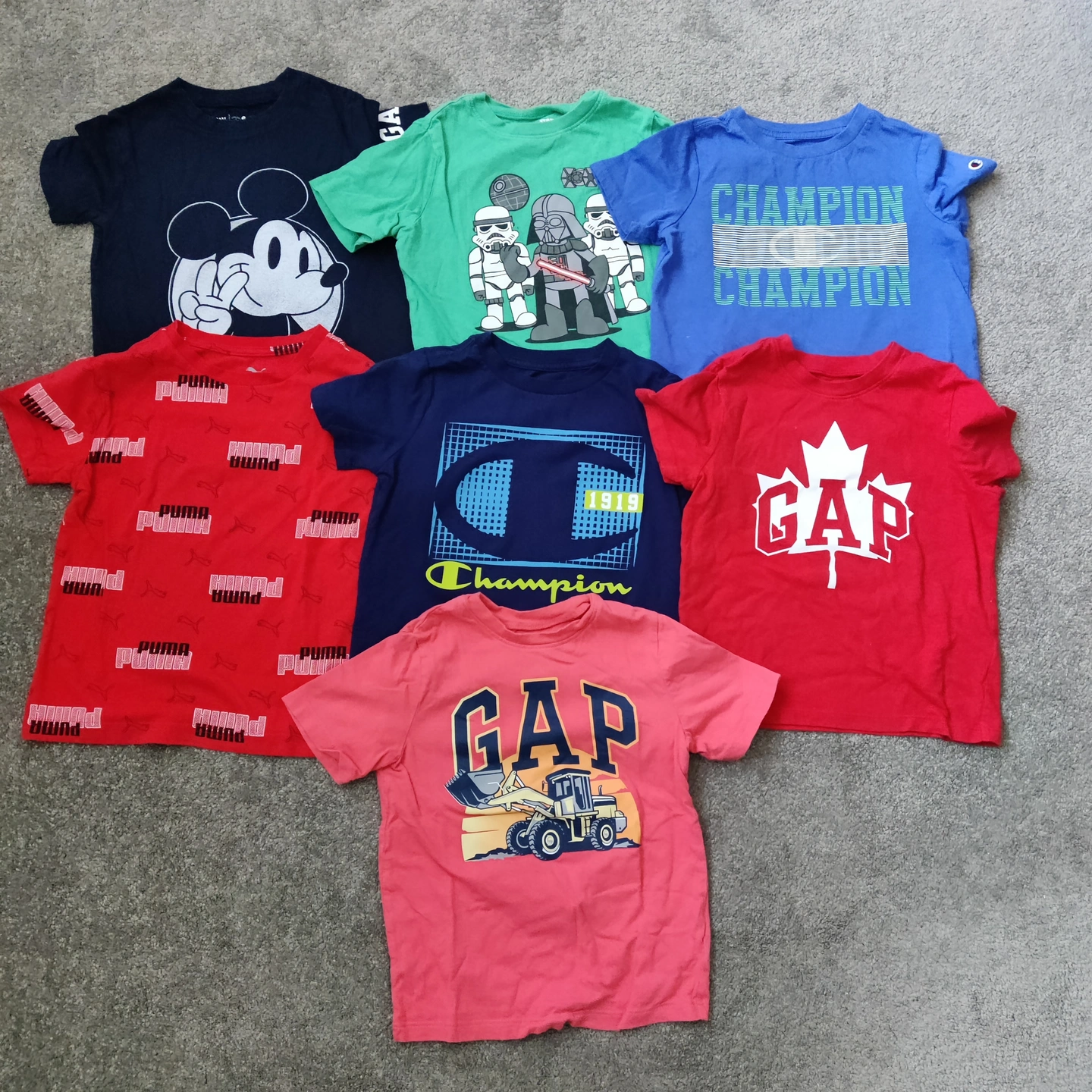 Set of 7 tshirts for boy's size 5 Gap Champion Puma Mickie Mouse In good used condition Measurements are approximate and taken laying flat Follow me on Instagram @renewifyupcycle for unique upcycled items