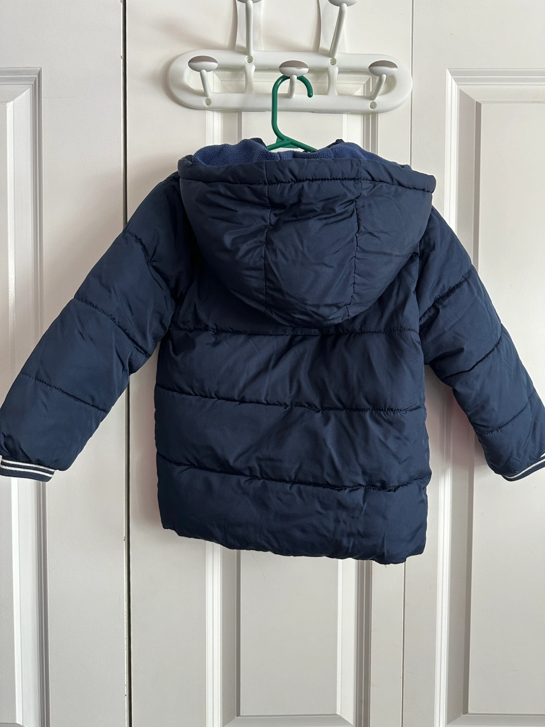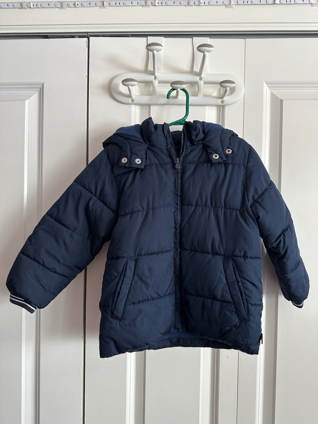 Navy blue puffer jacket. Size 4. Water-resistant. Fleece-lined hood. Features ribbed cuffs. Like new
