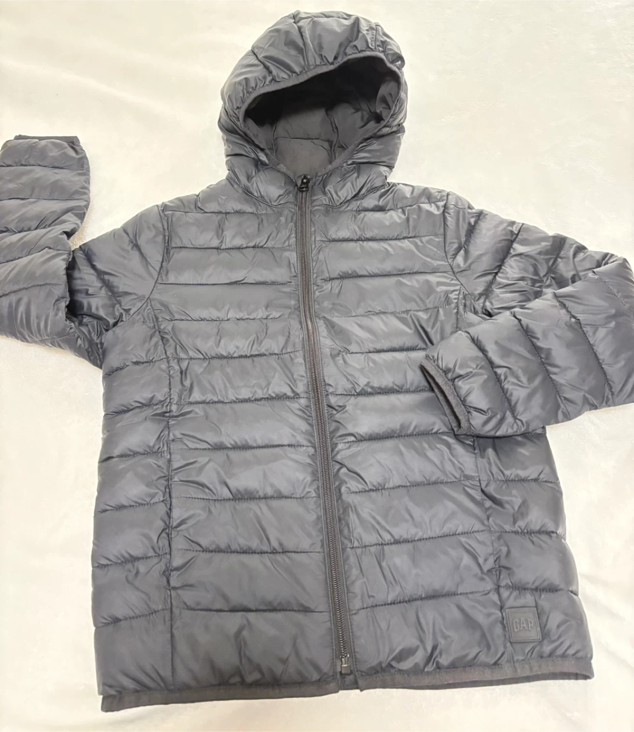 Selling a Gap Kids puffer jacket in size large. It's a water-resistant jacket made with 100% recycled material. The fill, shell, and lining are all made with recycled materials. It's a great lightweight jacket for kids!