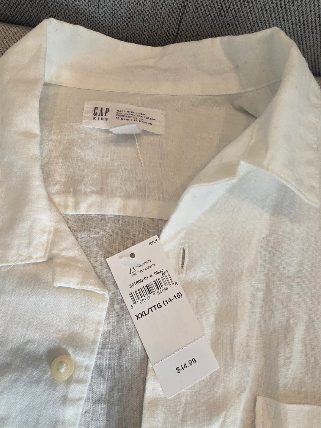 Selling a brand new GAP Kids white shirt, size XXL (14-16)! It's made with a blend of 55% linen and 45% cotton, so it's nice and breathable. The original price on the tag is $44.99