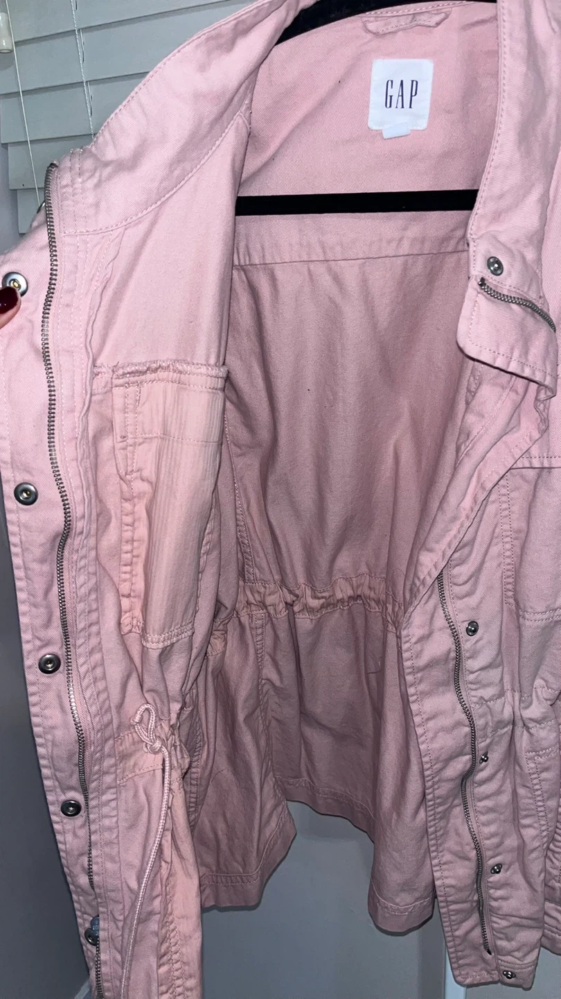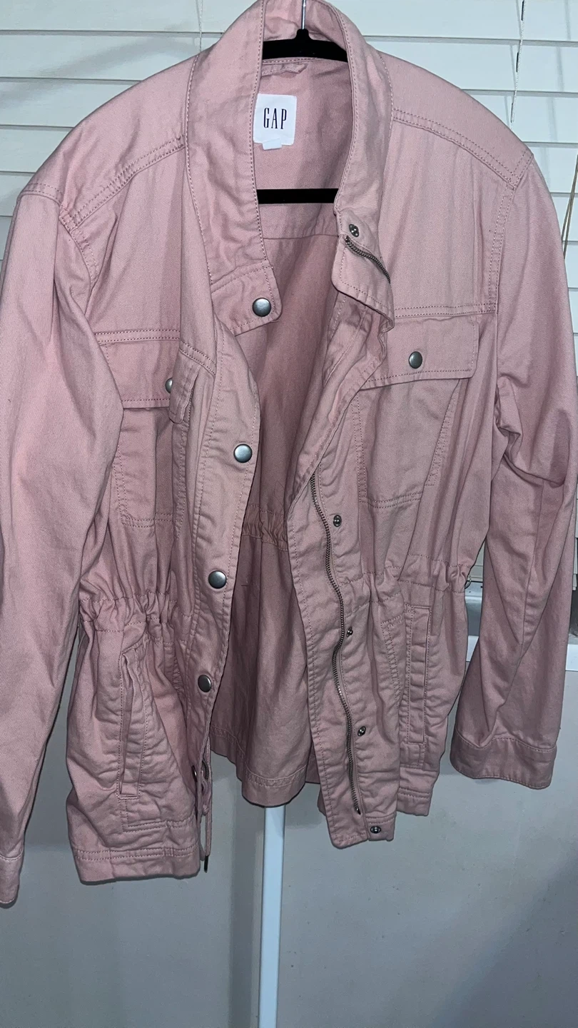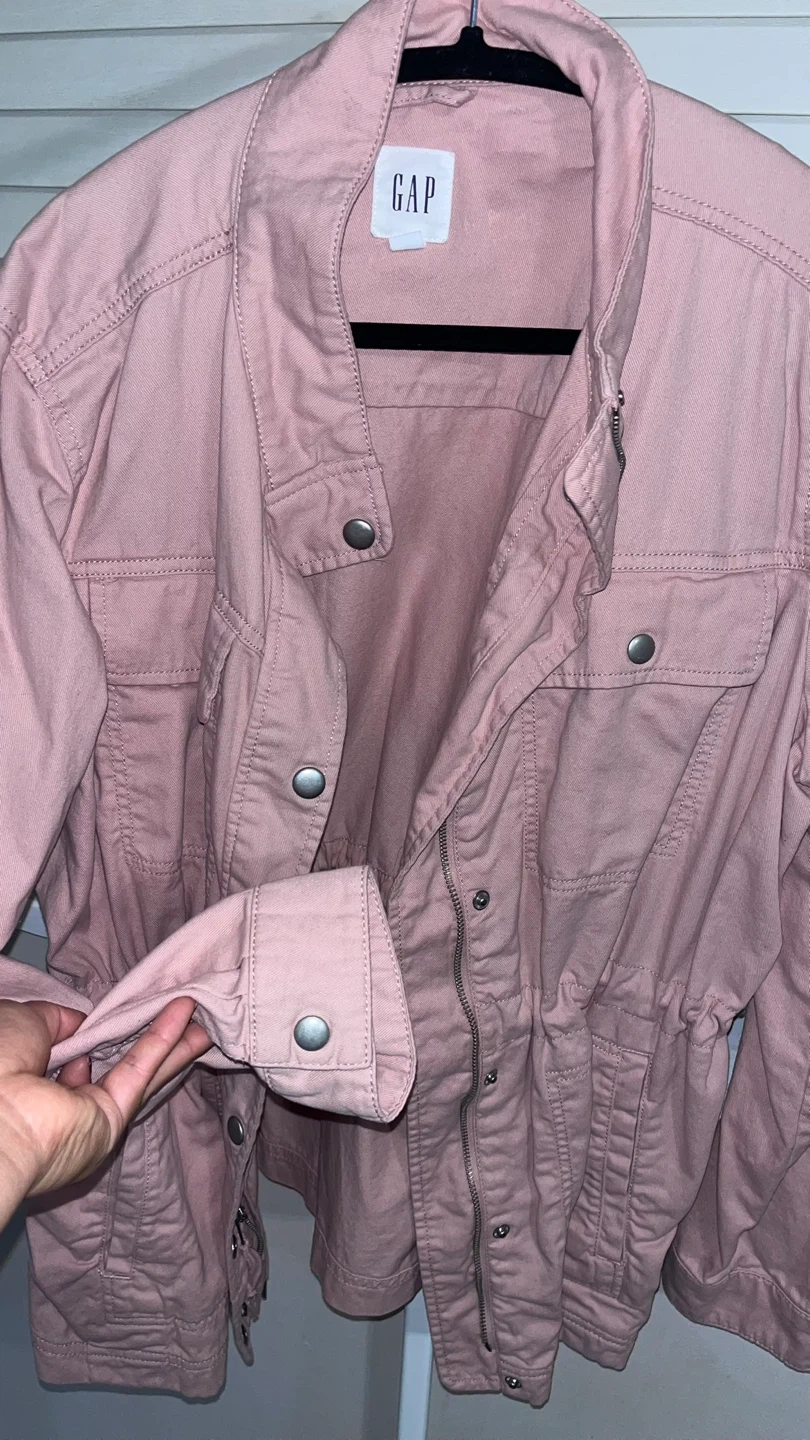Selling a cute pink Gap jacket! It's a size XL and has a drawstring at the waist. Perfect for layering or wearing on its own on a mild day