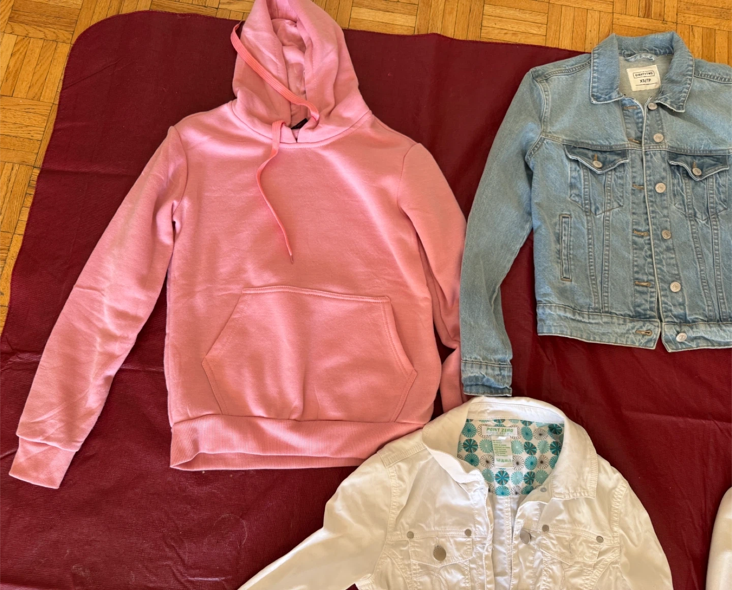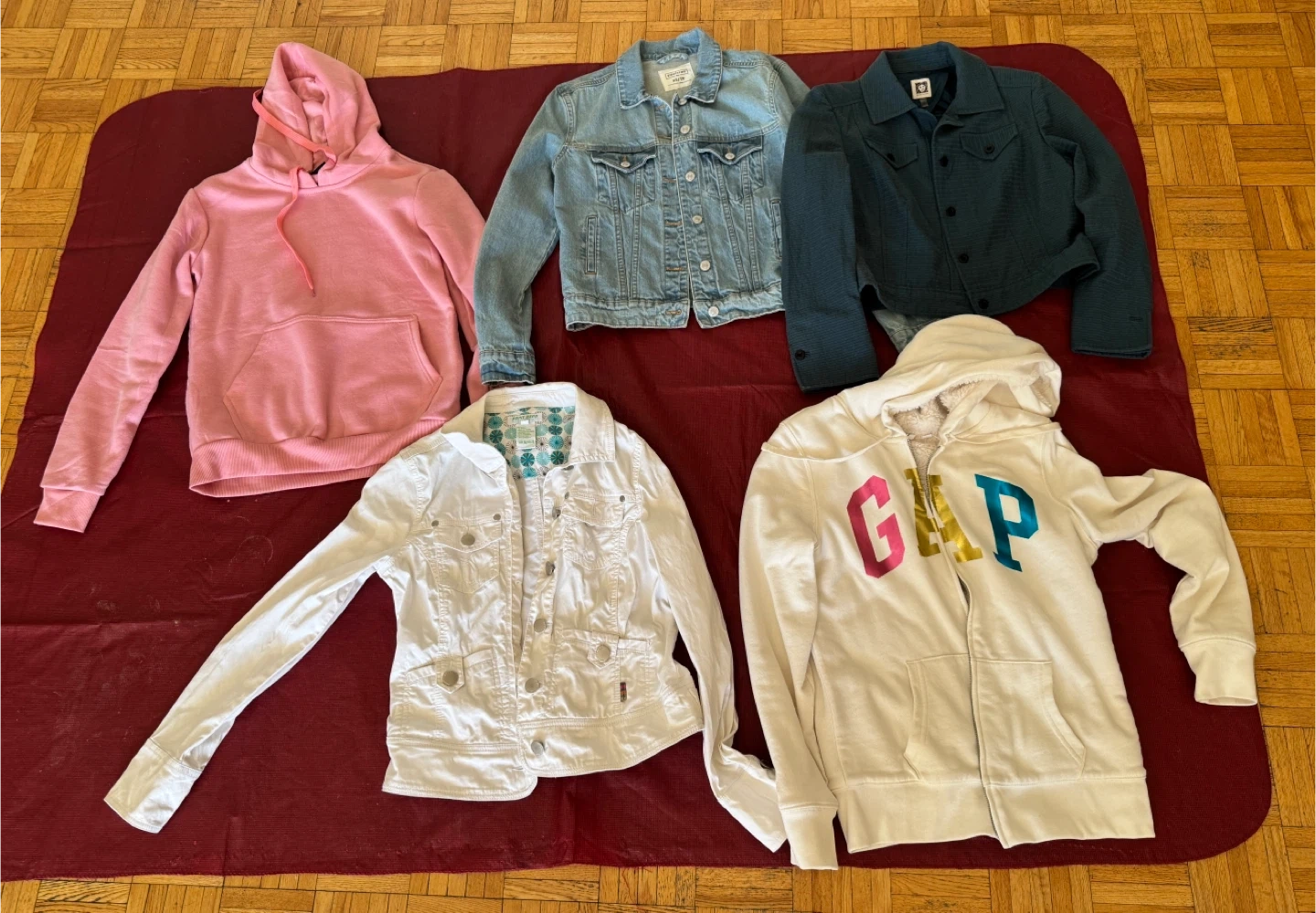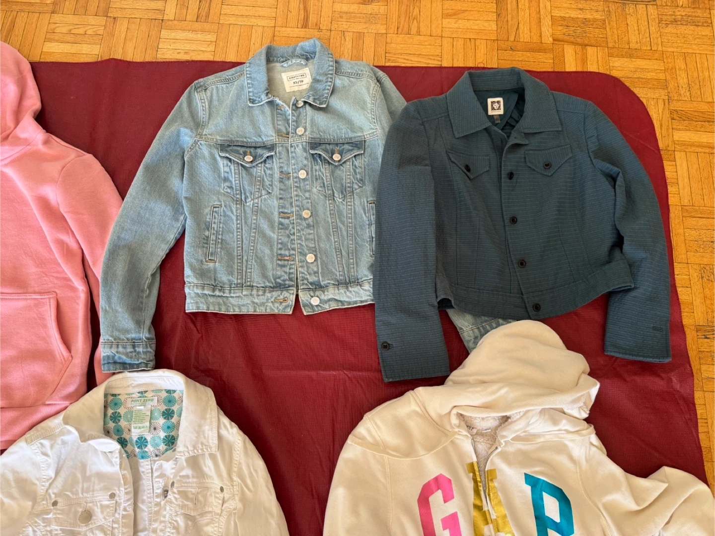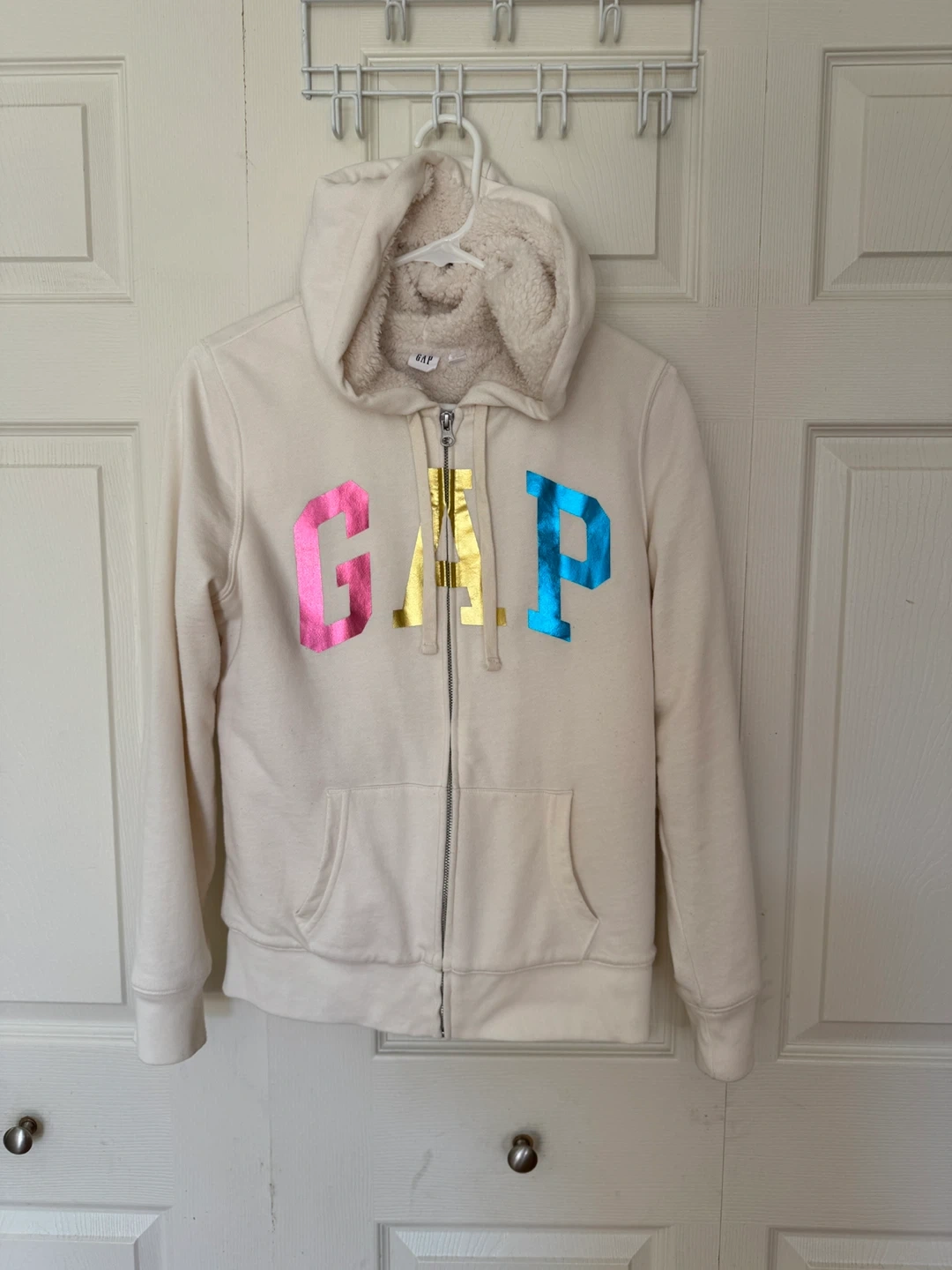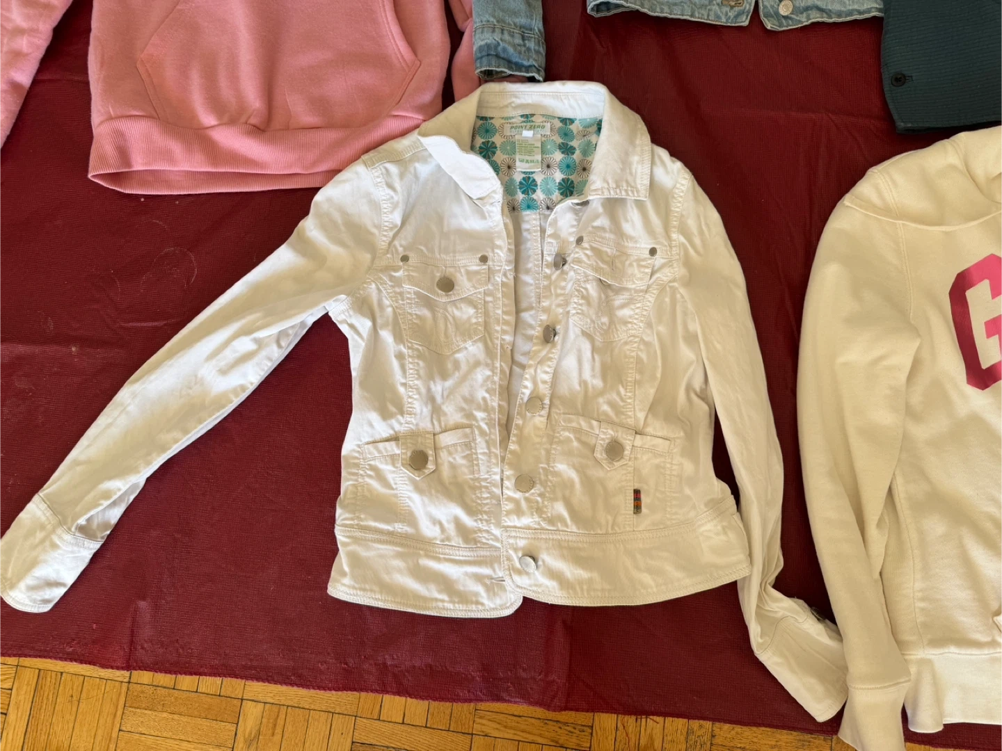 Selling a gently used Gap white zip-up hoodie. It features the GAP logo in colourful letters. It's a comfy and stylish piece for layering or just lounging around .Denim jacket .light white jacket Anne klein jacket All together 40$.Pickup near Dixie and Bloor