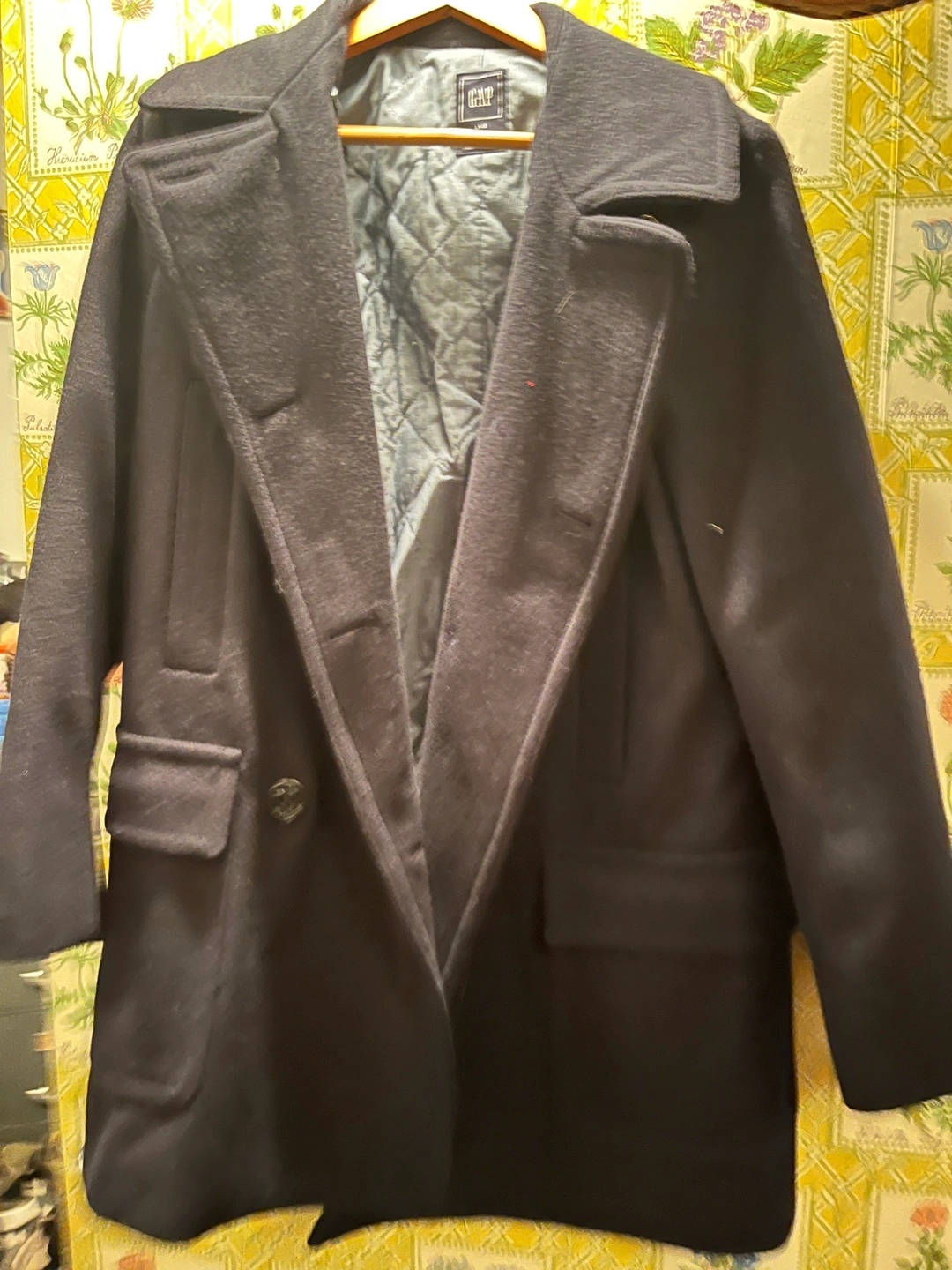 Women's peacoat. Dark grey. Double-breasted. Long sleeves. Pockets. Fully lined. Unworn.