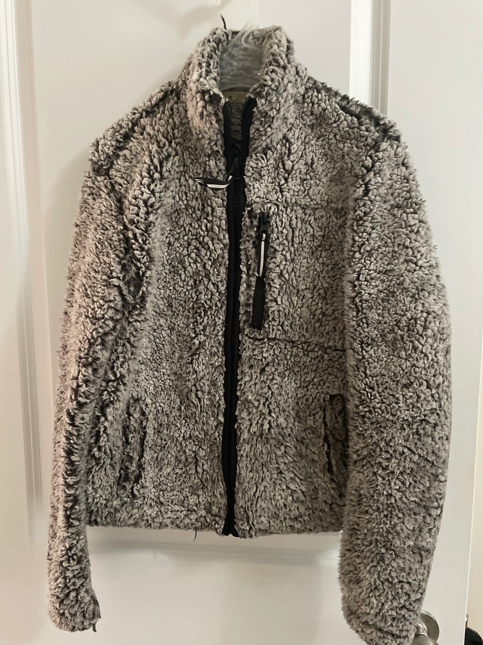 Size XS, grey fuzzy jacket with black zipper and pockets. Smoke free and pet free home