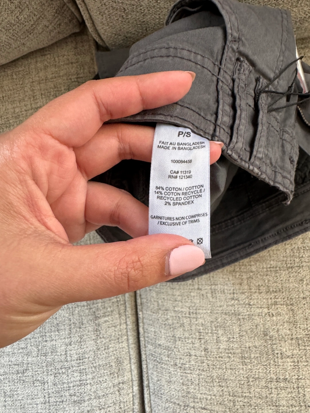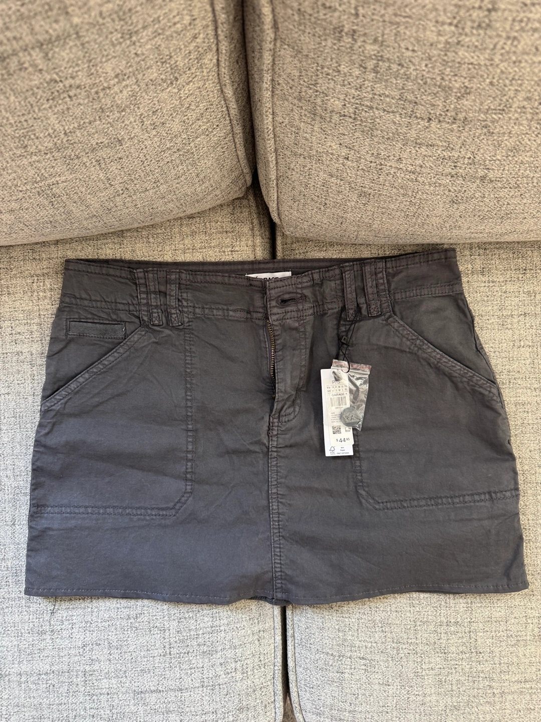 Selling a Garage mini skirt in dark grey! It's a size P/S (Petite/Small). The skirt is made of 84% cotton, 14% recycled cotton, and 2% spandex.